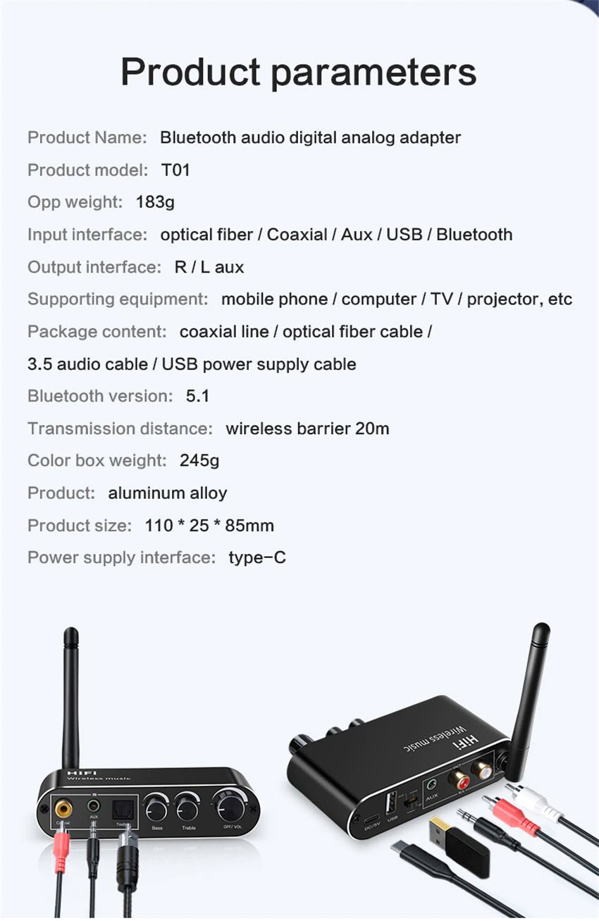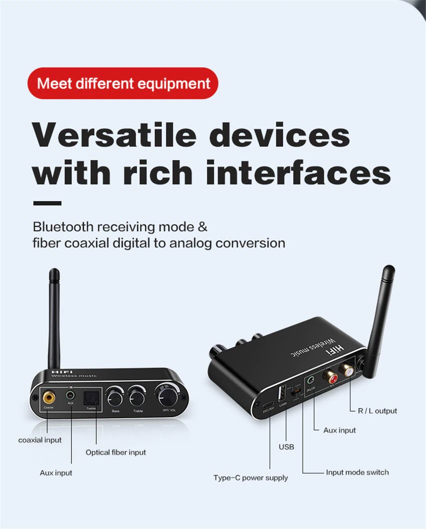 Tính năng: Bộ thu âm thanh tương thích với Bluetooth, bộ chuyển đổi âm thanh kỹ thuật số sang tương tự, bộ điều hợp phát lại đĩa flash USB. Có dây thành không dây, biến
