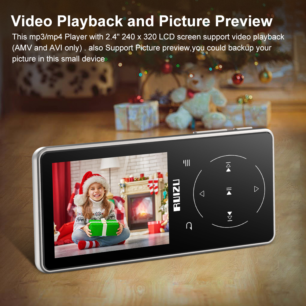 Key Features:1, Music Play: Music support Equalizer,Repeat or Shuffle Mode. Free to add your favorite music to playlist.2, Audio Book Play: Continue playing audio from last time you quit. Hold on Play Button 5s to turn on/off.3, E-Book Reading: Add a bookmark wherever you want, continue your last reading easily.4, FM radio: A built-in FM tuner lets you listen to your favorite FM radio station.5, Build-in Speaker: Enjoy the music with build-in loud speaker!File Format Support:Audio: MP3/ WAV/ APE/ WMA/FLAC file.Text: TXT file.Picture: JPG/JPEG/BMP file.Video: 160 x 128 AMV file.Specifications:Screen: 2.4inch Color ScreenScreen Resolution: 240 X 320Internal Memory: 8GBMicro SD Card: maximum support 128GB (not included)FM Receiving Frequency: 87 MHz~108 MHzPackage:1 X RUIZU D16 MP3 Player1 X User Manual1 X USB Cable1 X EarphoneRUIZU D16 Metal Style MP3 player allows you to listen to high-quality music during your workout or outdoor activities. With durability that matches your stamina, dynamic sound to keep you in the zone, and with 48hrs Playback, the player offers long time music time for enjoying. Internal 8GB memory and an integrated micro SD card slot lets you add even more storage, staying motivated will be a snap. All that plus an FM tuner and large, intuitive color LCD screen for on-the-move navigation make the Sport player the perfect workout partner.