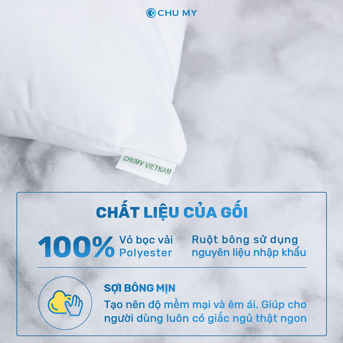 Gối Premium Sử dụng chất liệu gòn tơi chất lượng cao đảm bảo các sợi gòn đáp ứng được độ mềm mại, thấm hút tốt, không thô và xơ cứng gây nhức mỏi cổ và