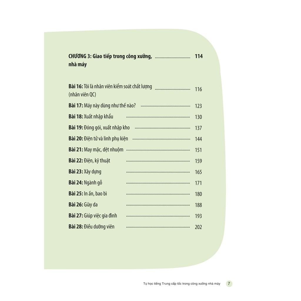 Cuốn sách “Tự học Tiếng Trung cấp tốc trong công xưởng, nhà máy” ra đời cũng vì mục đích đó. Với các chủ đề đa dạng, từ giao tiếp thông dụng tới giao tiếp theo chuyên ngành, cuốn sách sẽ phù hợp cho nhiều đối tượng khác nhau, đặc biệt là những người bận rộn muốn học tiếng Trung có trọng điểm, tiết kiệm thời gian và có thể ứng dụng ngay trong công việc.