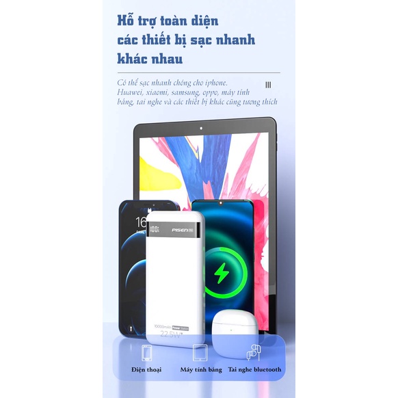 Với công suất của pin dự phòng Pissen Power Station 10000mAh 22,5W là 22.5W, điều này đã làm tăng hiệu quả sạc nhanh gấp 3 lần những sản phẩm pin sạc dự phòng thông thường. Với dung lượng khủng 10.000 mAh, pin vẫn đảm bảo cho bạn khả năng đáp ứng sạc nhanh cùng lúc 3 thiết bị mà vẫn an toàn nhất.