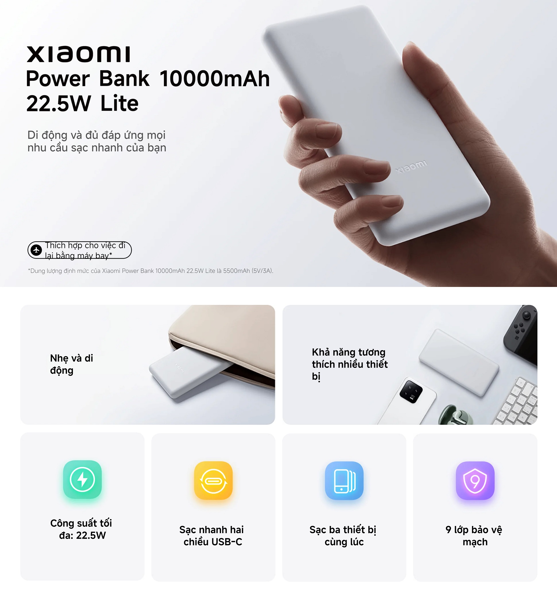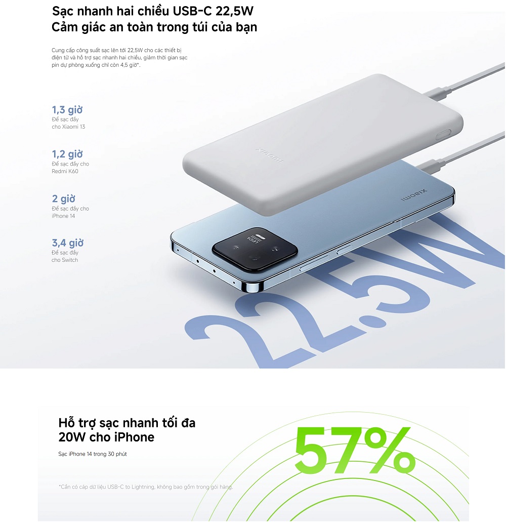Pin sạc dự phòng Xiaomi 10000mAh 22.5W Lite không chỉ gây ấn tượng bởi thiết kế mỏng gọn và di động, mà còn nổi bật với khả năng sạc nhanh đáng kinh ngạc lên đến 22.5W. Điều này cho phép bạn sạc cùng lúc tới 3 thiết bị, tạo ra trải nghiệm sử dụng thuận tiện và hiệu quả. Với dung lượng pin lớn, Pin sạc dự phòng Xiaomi 10000mAh 22.5W Lite chắc chắn sẽ là sự lựa chọn hoàn hảo cho những người đang tìm kiếm một pin dự phòng giá rẻ, có khả năng tương thích với đa dạng các dòng điện thoại.