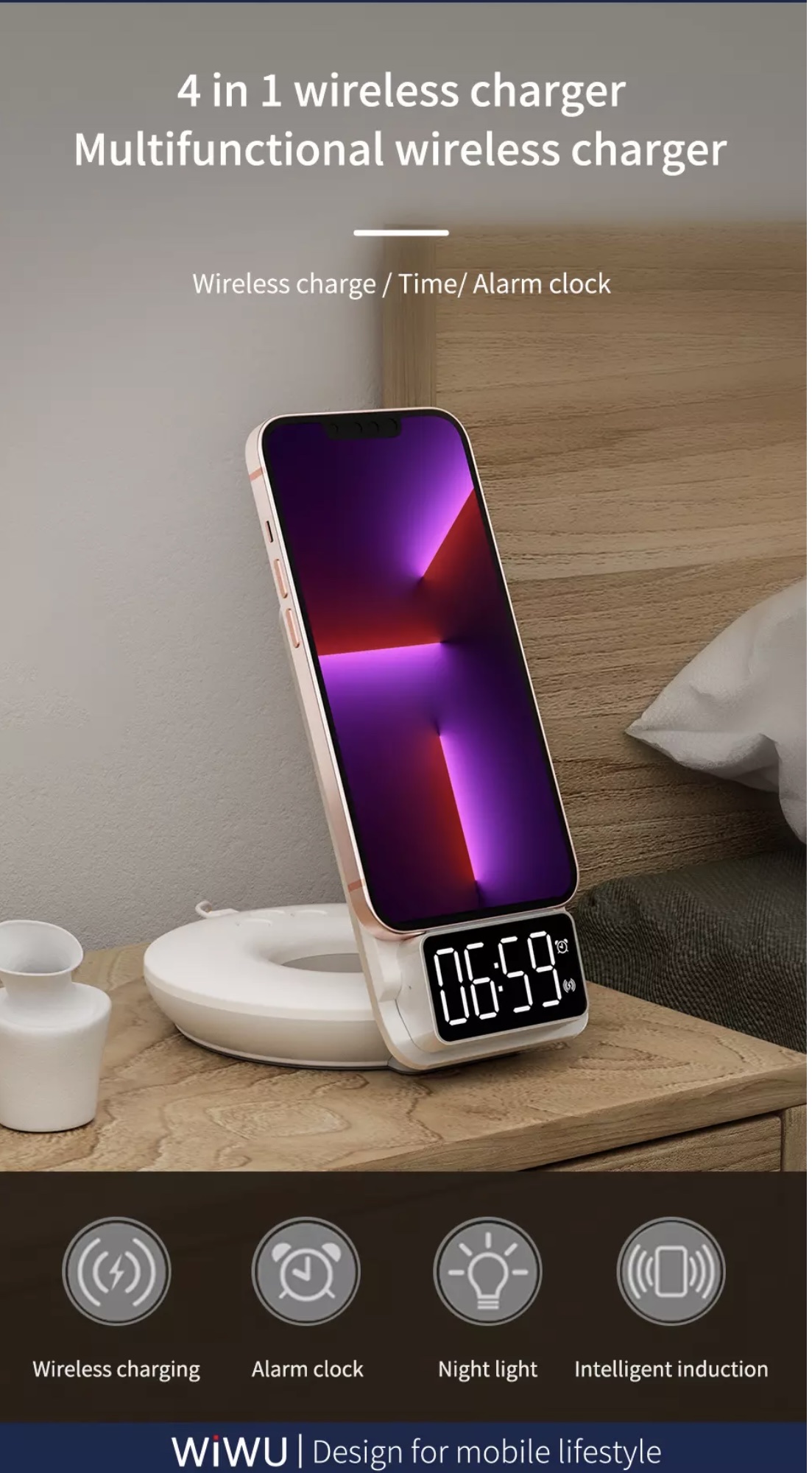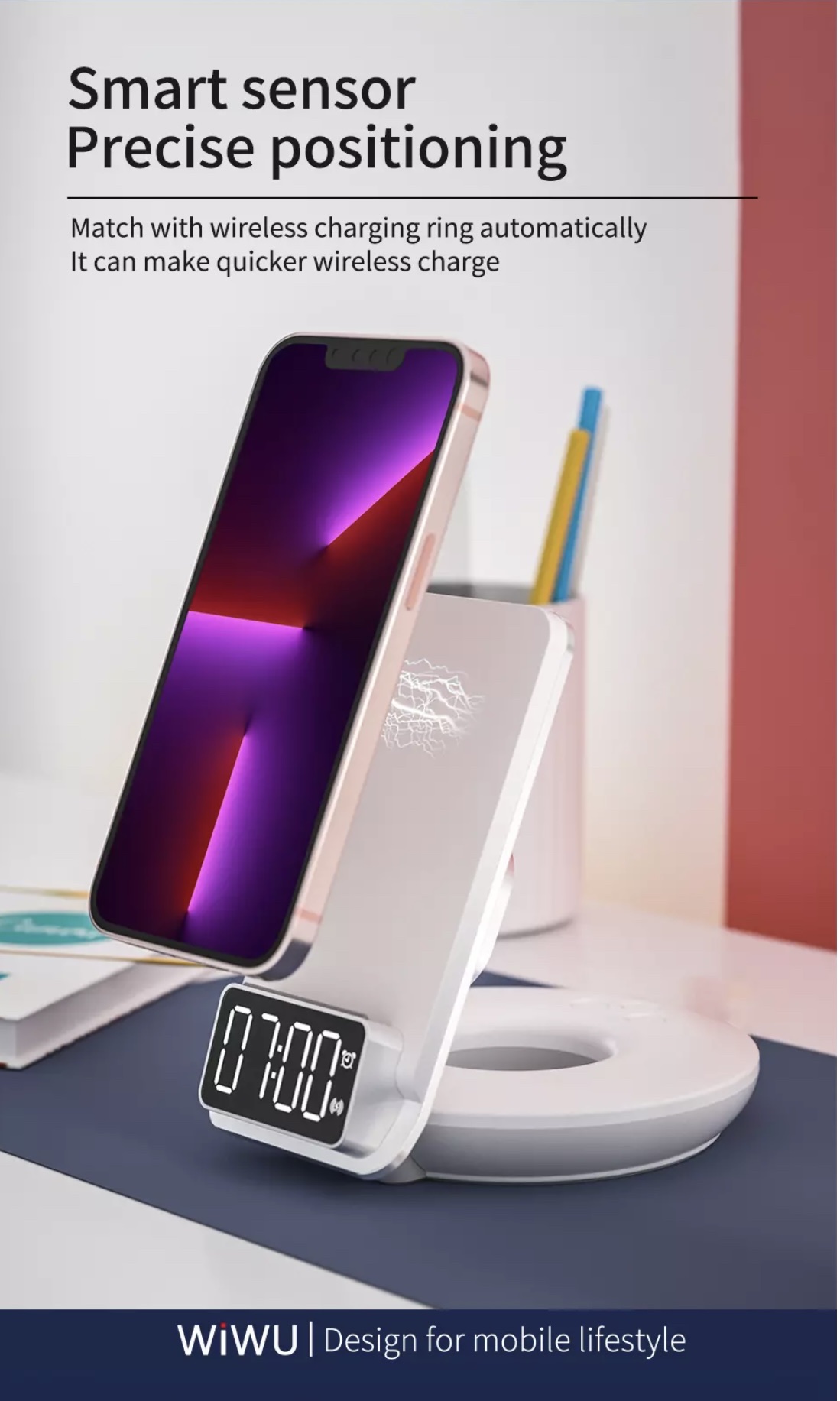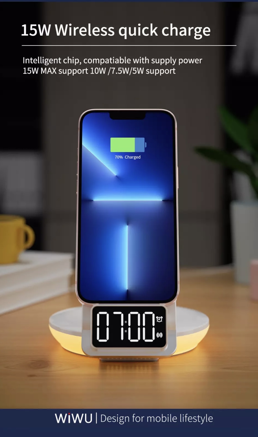 Mua tại TiktokSạc Wiwu Automatic Positioning 4 in 1 M11 Thương hiệu: Wiwu Mô tả sản phẩm - Chất liệu: hợp kim nhôm chất lượng cao và bền - Bộ sạc không dây 4 in 1 và là giá đỡ để bàn cho điện thoại - Hỗ trợ sạc không dây nhanh - Cuộn dây có thể tháo rời, ngang và dọc - Định vị chính xác - Sạc có chế độ đèn ban đêm ánh sáng dịu nhẹ và thoải mái - Xung quanh sạc ánh sáng ấm áp và sáng sủa - Điều chỉnh đa hướng sử dụng trong nhiều tình huống - Sạc có đồng hồ hiển thị giờ - Hỗ trợ cho tất cả các máy có chế độ sạc không dây. Bộ chuyển đổi dành cho di động 4.7- 6.9inch - Đầu ra: 5V = 3A 9V = 2.3A - Giao diện: loại C - Tỉ lệ đầu ra: 15W ( hỗ trợ 10W/7,5W,5W)