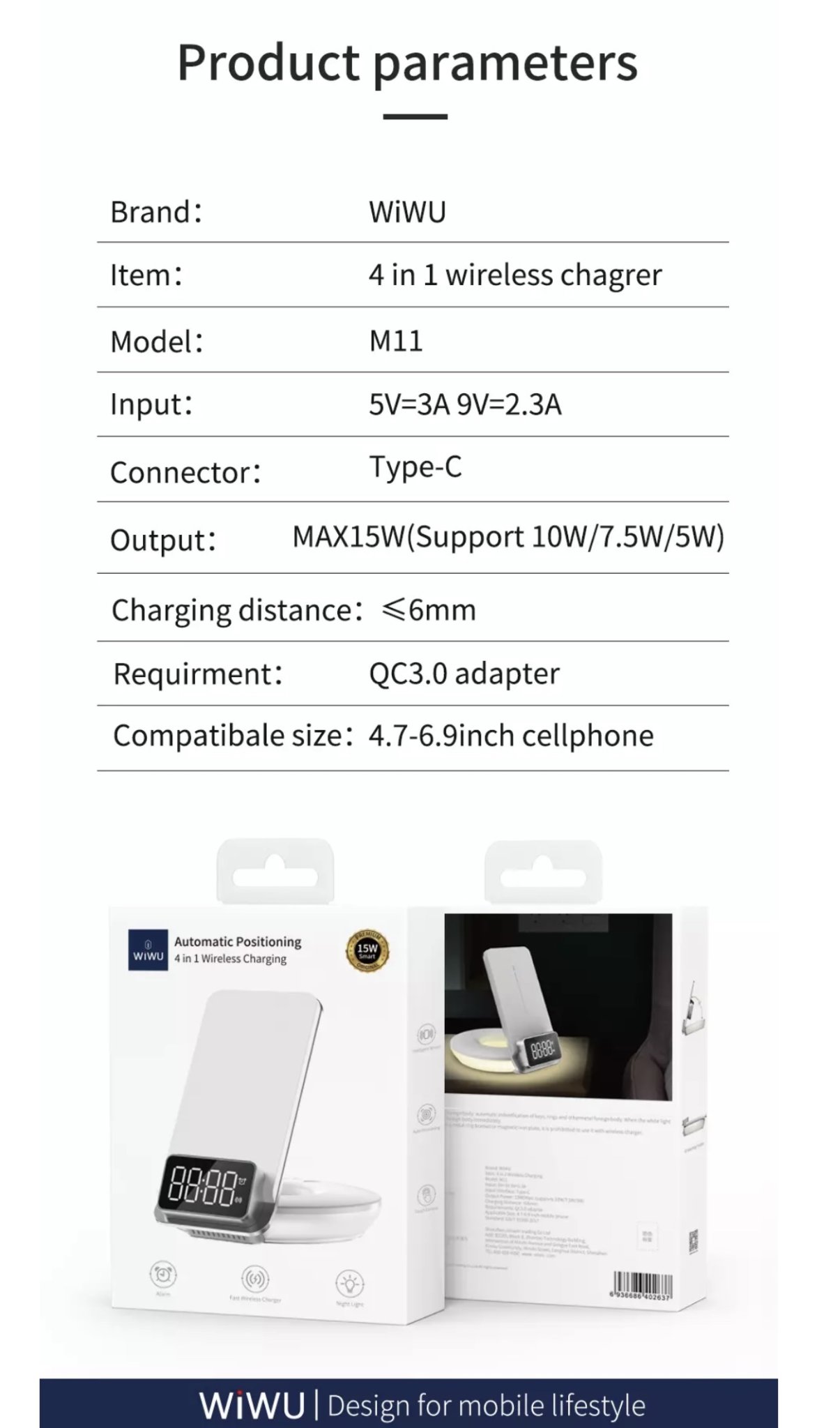 Thông số kỹ thuật: 1. Đầu vào: DC5V / 2.0A, tối đa 9V / 2.0A. 2. Công suất 1: 5W / 7.5W / 10W (điện thoại di động). Đầu ra 2: 2W (iWatch). 4. Chất