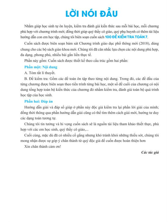Nhằm giúp học sinh tự ôn luyện, kiểm tra đánh giá kiến thức sau mỗi bài học, mỗi chương phù hợp với chương trình mới; đồng thời giúp quý thầy cô giáo, quý phụ huynh có thêm tài liệu hướng dẫn con em học tập, chúng tôi biên soạn cuốn sách 100 ĐỀ KIỂM TRA TOÁN 7.