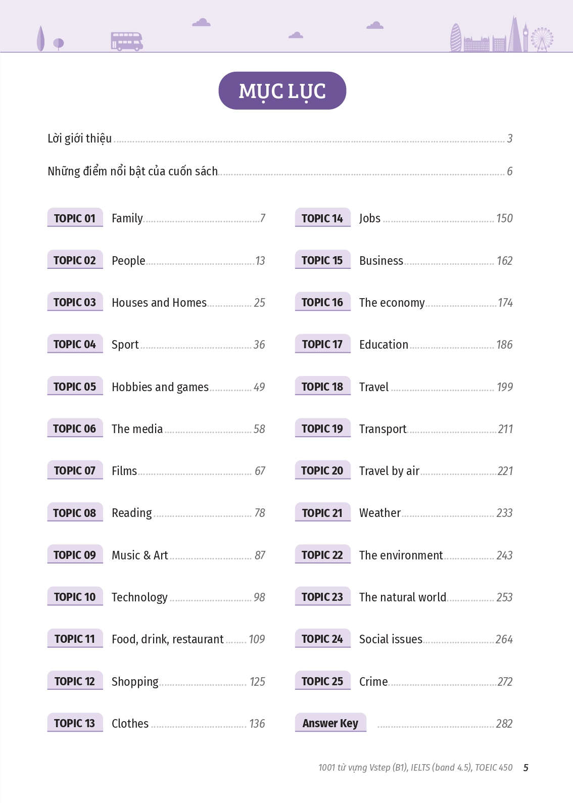 Từ vựng trong cuốn sách được sắp xếp theo 25 chủ đề quen thuộc nhất giúp việc học từ vựng theo trật tự logic dễ nhớ dễ thuộc hơn học từng từ riêng lẻ
