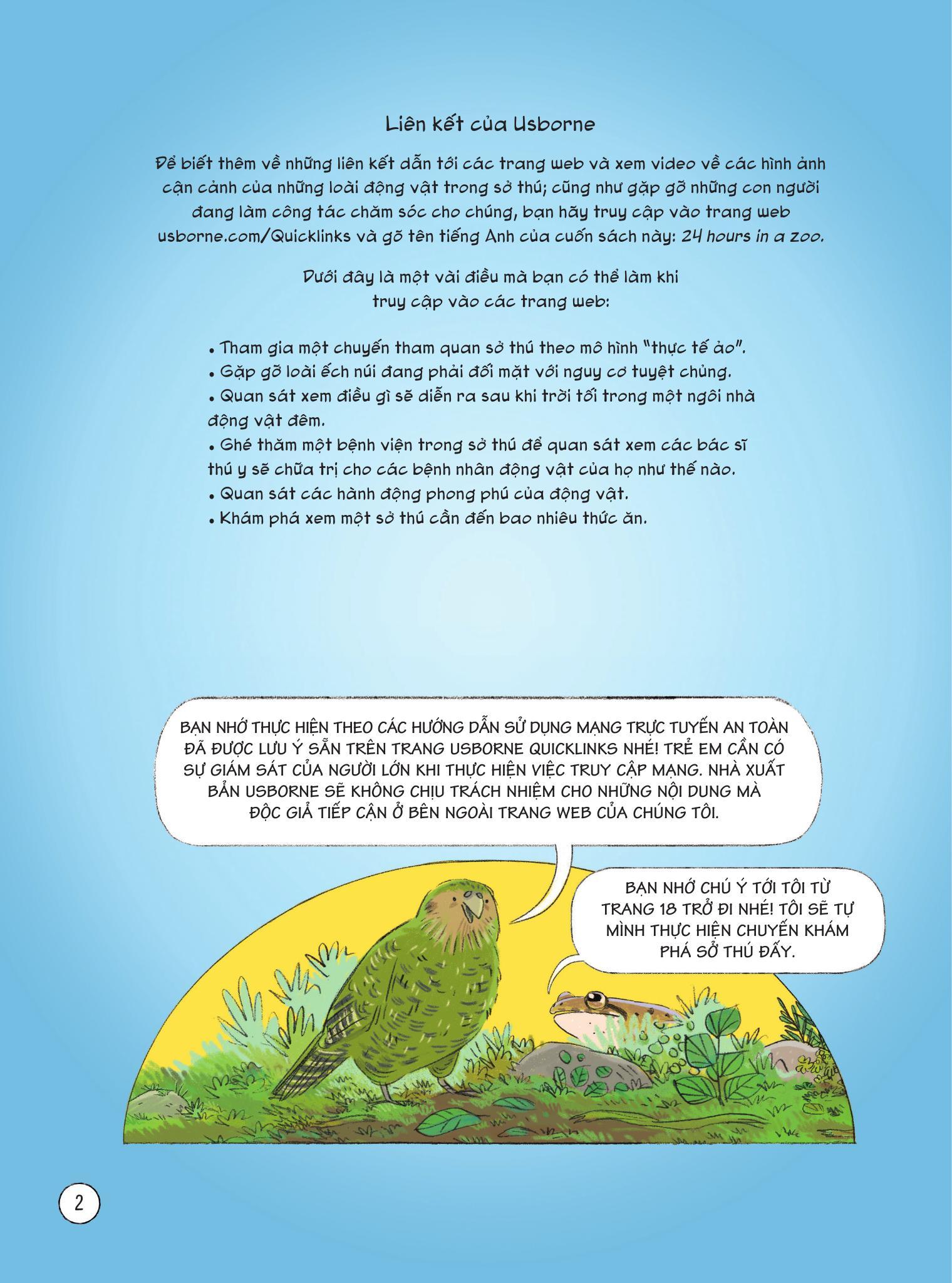 24 Giờ Trong Sở Thú Bạn sẽ được tìm hiểu điều gì xảy ra trong sở thú từ lúc bình minh cho đến khi màn đêm buông xuống. Người ta kiểm tra sức khỏe cho một con trăn khổng lồ ra sao, cách sở thú chuẩn bị cho sự kiện giới thiệu một động vật mới đến thế nào, điều gì sẽ xảy ra nếu một con vật bị mất tích? Và nhất là: Làm thế nào để xử lý hàng tấn chất thải động vật mỗi ngày? Quả thật, công việc tại sở thú chẳng hề đơn giản như bạn nghĩ đâu! Qua từng giờ đồng hồ, bạn đọc sẽ được tìm hiểu vô vàn những bí mật nơi "hậu trường" của sở thú đấy. Nhanh lên nào, chúng m.ình cùng khám phá ngay thôi! Sách khoa học theo định dạng truyện tranh, đưa các bạn nhỏ theo chân những nhân viên sở thú khám phá hàng trăm loài động vật trong sở thú