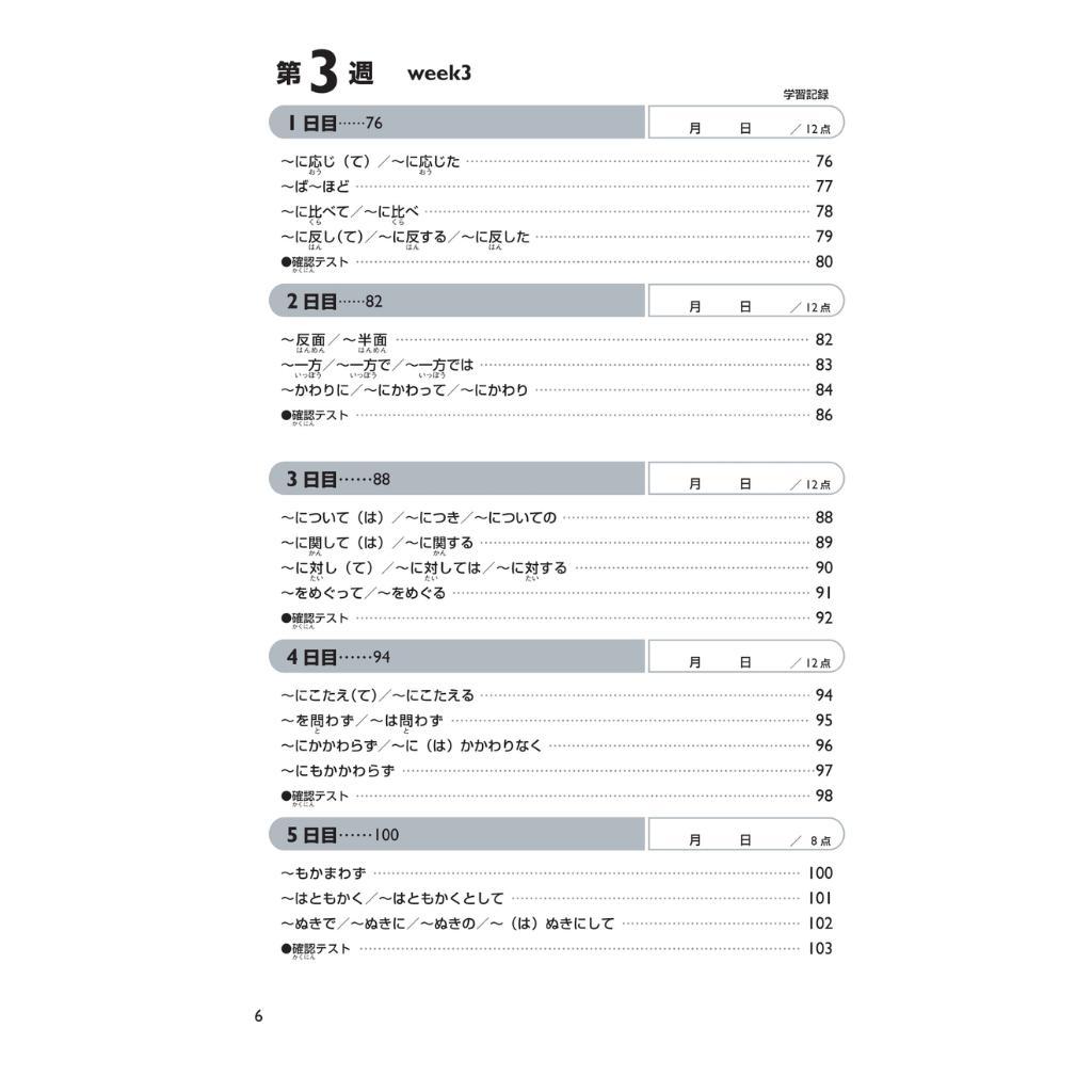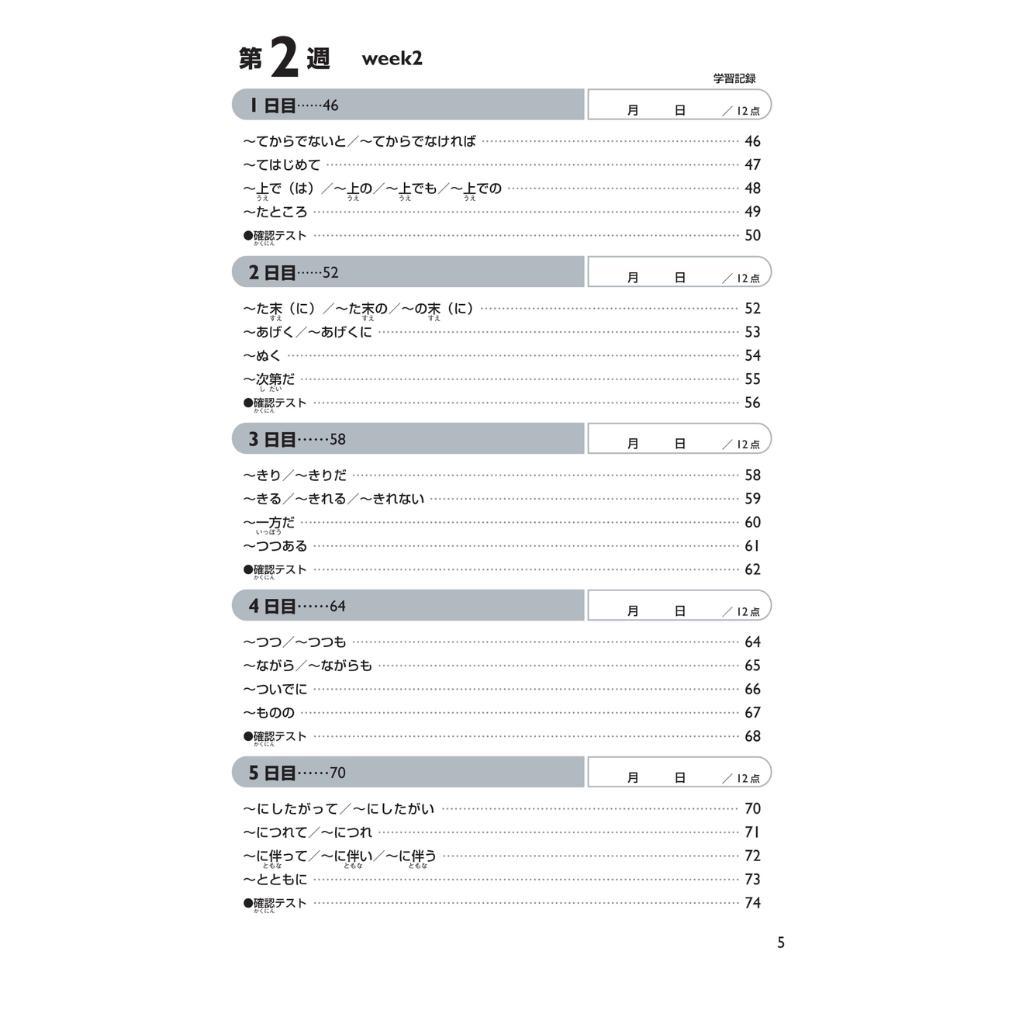 Các mẫu ngữ pháp được sắp xếp giúp dễ dàng ghi nhớ. Mỗi ngày, người học sẽ học từ 3 đến 5 mẫu ngữ pháp (6 trang sách) và sẽ hoàn thành trong 9 tuần. Bằng cách đặt các mẫu ngữ pháp có nghĩa tương tự và các mẫu ngữ pháp có khả năng gây nhầm lẫn vào trong cùng 1 bài, giáo trình giúp người học nắm vững một cách hiệu quả những điểm then chốt dễ bị hỏi trong kỳ thi thực tế. Ngoài ra, giáo trình cũng cung cấp “lộ trình học tập” giúp bạn có thể kiểm tra lại những kiến thức đã học.