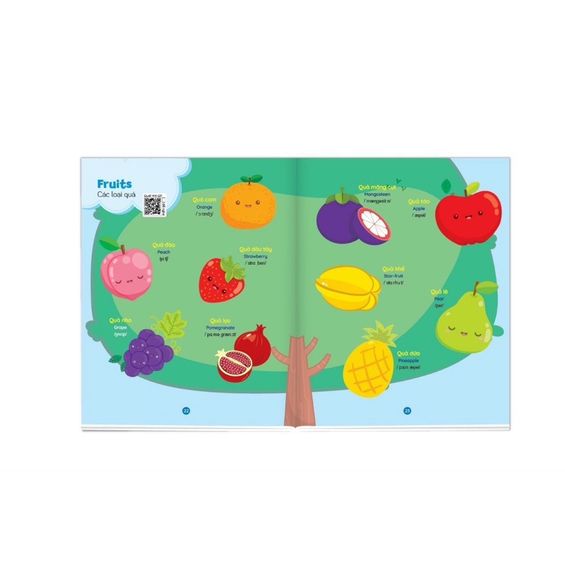 Sách có kèm file nghe quét mã QR với giọng đọc tiếng Anh chuẩn để cha mẹ và con cùng nghe và tắm ngôn ngữ mỗi ngày.