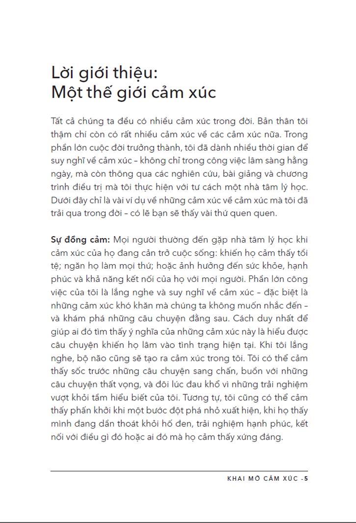 Trong “Khai mở cảm xúc”, hình ảnh đại diện mà tác giả sử dụng để mô tả cảm xúc của chúng ta là tàu lượn siêu tốc, một chuyến tàu lượn có lúc lên cao, có lúc xuống thấp và lượn vòng vòng trên suốt hành trình. Chuyến tàu của mỗi người sẽ mỗi khác, vì mỗi người có một bối cảnh, quá khứ, cơ thể và bộ não khác biệt. Điều đó ảnh hưởng đến cách chúng ta hiểu, trải nghiệm và phản ứng với cảm xúc của m.ình. Vậy bạn phải làm gì để điều chỉnh khi tàu lượn của m.ình rơi vào vùng cảm xúc khó khăn, hay vướng vào một vòng lặp không lối thoát? Và làm thế nào để tạo ra những cảm xúc dễ chịu?
