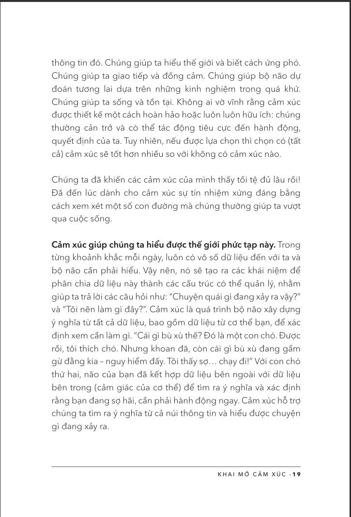 Hơn nữa, tất cả cảm xúc đều rất cần thiết cho con người chứ không chỉ riêng những cảm xúc dễ chịu. Chúng giúp ta xử lý thông tin đầu vào mà các giác quan cung cấp, giúp ta suy luận và đưa ra quyết định. Chúng giúp ta hiểu thế giới và biết cách ứng phó, giúp ta biết cách giao tiếp và đồng cảm với người khác. Chúng giúp bộ não dự đoán tương lai dựa trên những kinh nghiệm trong quá khứ. Tóm lại, cảm xúc giúp ta sống sót và tồn tại.