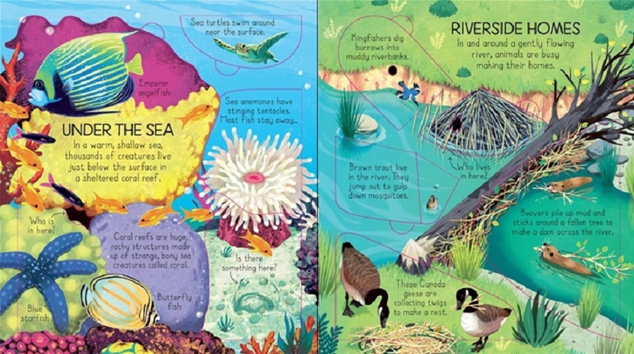 From nests in treetops to dark underground burrows, there are lots of animal homes to discover in this fascinating book. Lift the flaps to see how animals build homes in extreme temperatures, shelter in a warm coral reef, or on a riverbank and lots more. With over 80 flaps to lift and links to websites with videos and pictures of real animal homes.