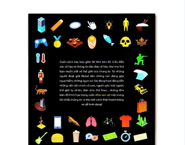 Cuốn sách này bao gồm 50 tấm bản đồ, biểu diễn các số liệu và thông tin độc đáo về hầu như mọi thứ bạn muốn biết về thế giới của chúng ta. Từ những người đoạt giải Nobel đến những loài đang gặp nguy hiểm, những ngọn núi lửa đang hoạt động đến những nền văn minh cổ xưa, nguồn gốc loài người, thế giới tự nhiên, điện ảnh, thể thao... những tấm bản đồ hình họa trong cuốn Atlas vạn vật này mang tới nhiều thông tin lý thú một cách thật hoành tráng và dễ hình dung!