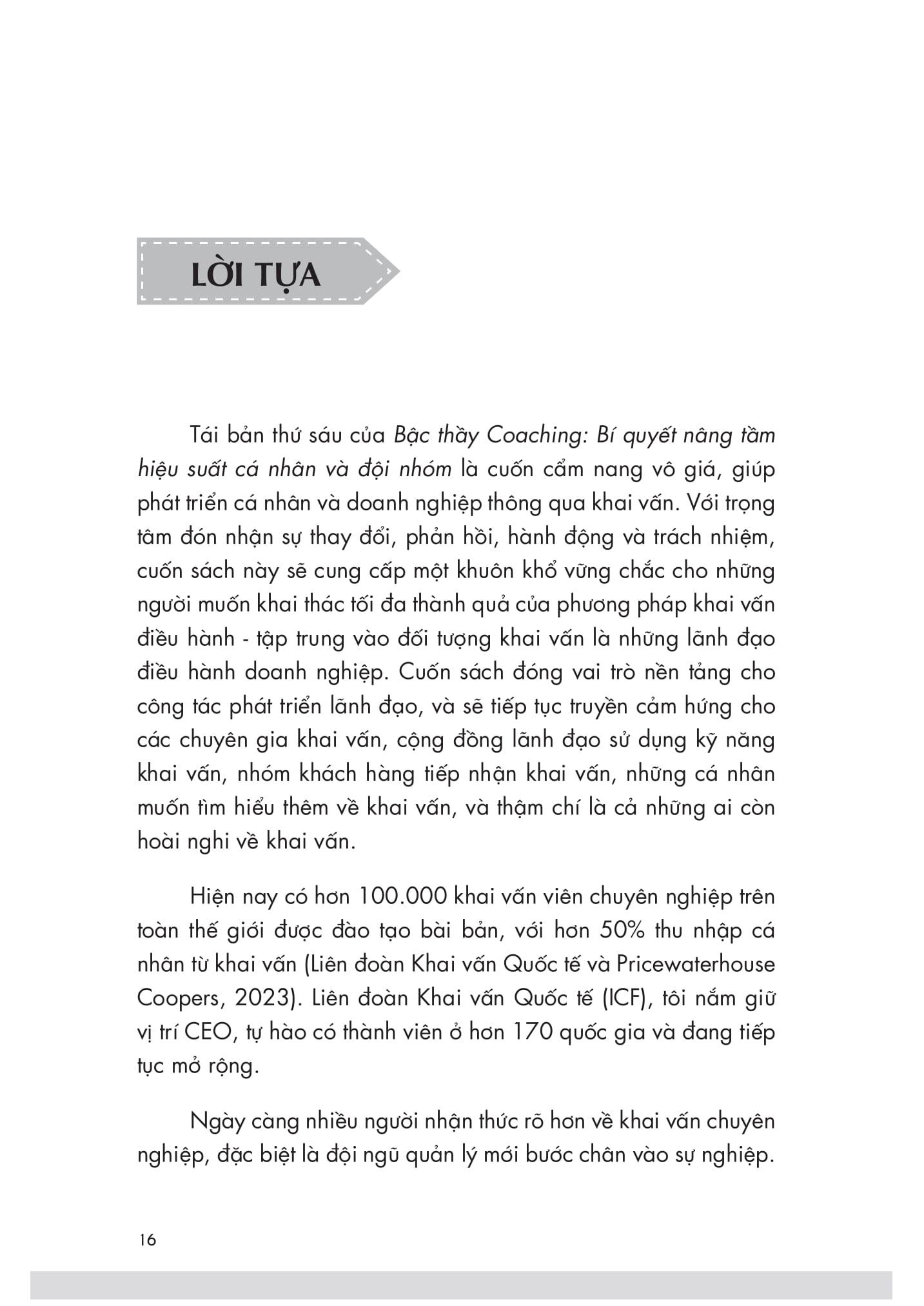 trên đây là những nội dung của cuốn “bậc thầy coaching” mà chúng tôi muốn giới thiệu đến bạn đọc, những ai đang tìm kiếm một phương pháp phát triển bản thân, nâng cao hiệu suất và truyền cảm hứng cho người khác một cách sâu sắc và bền vững. hy vọng cuốn sách sẽ trở thành người bạn đồng hành tin cậy trên hành trình trở thành nhà khai vấn – người dẫn dắt bằng sự thấu hiểu, đồng hành bằng sự chân thành, và lan tỏa giá trị bằng chính sự trưởng thành từ bên trong.