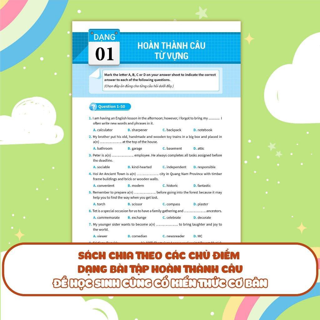 Với bài tập Hoàn thành câu trong kì thi vào 10 và 10 chuyên, cuốn sách phân chia làm 2 dạng: 200 câu hỏi dạng hoàn thành câu từ vựng và 200 câu hỏi dạng hoàn thành câu ngữ pháp