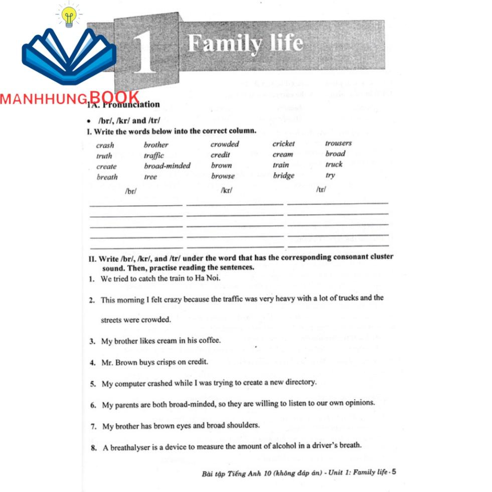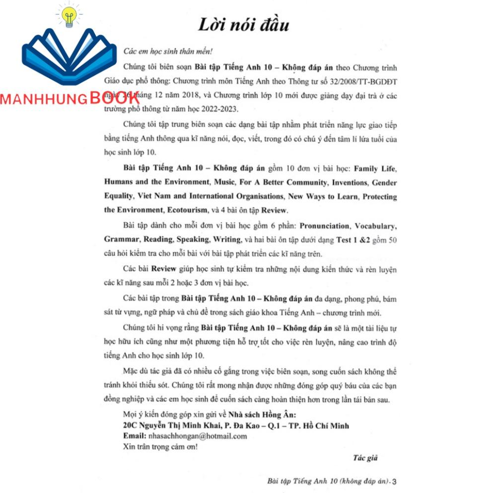 Bài Tập Tiếng Anh 10 - Không Đáp Án (Biên Soạn Theo Chương Trình GDPT Mới) gồm 10 đơn vị bài học: Family Life, Humans and the Environment, Music, For A Better Community, Inventions, Gender Equality, Viet Nam and International Organisations, New Ways to Learn, Protecting the Environment, Ecotourism, và 4 bài ôn tập Review.
