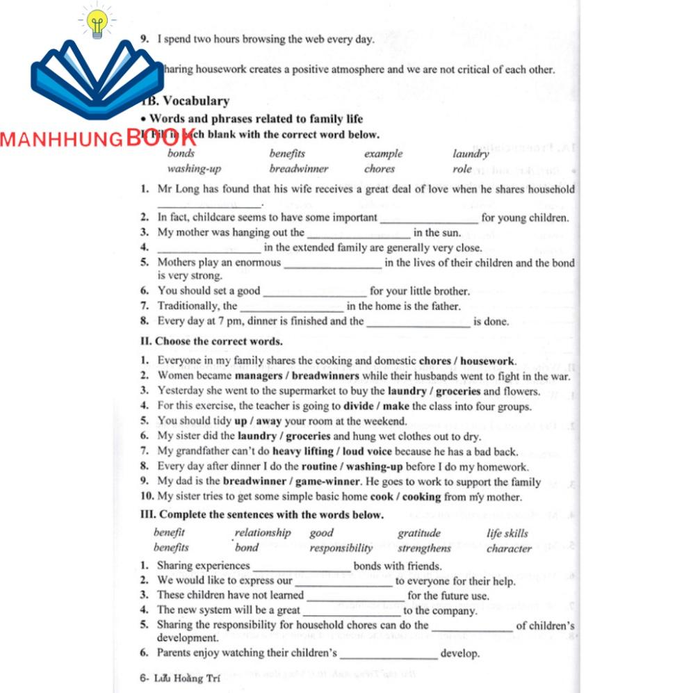 Bài tập dành cho mỗi đơn vị bài học gồm 6 phần: Pronunciation, Vocabulary, Grammar, Reading, Speaking, Writing, và hai bài ôn tập dưới dạng Test 1 & 2 gồm 50 câu hỏi kiểm tra cho mỗi bài với bài tập phát triển các kỹ năng trên.
