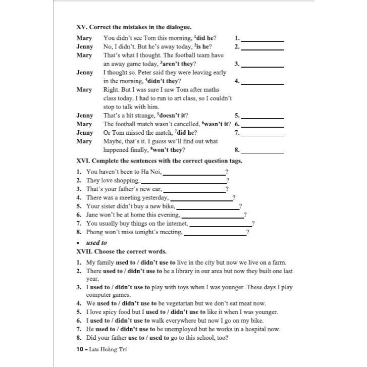 Bài tập Tiếng Anh 9 – Không đáp án gồm một bài ôn tập củng cố kiến thức đã học (Starter Unit), và 8 đơn vị bài học chính: Then and now; Lifestyles; Our surroundings; Feelings; English and world discovery; The self; On the streets; Scary. Sau mỗi đơn vị bài học đều có bài ôn tập Review. Bài tập dành cho mỗi đơn vị bài học chính gồm 6 phần: Vocabulary,