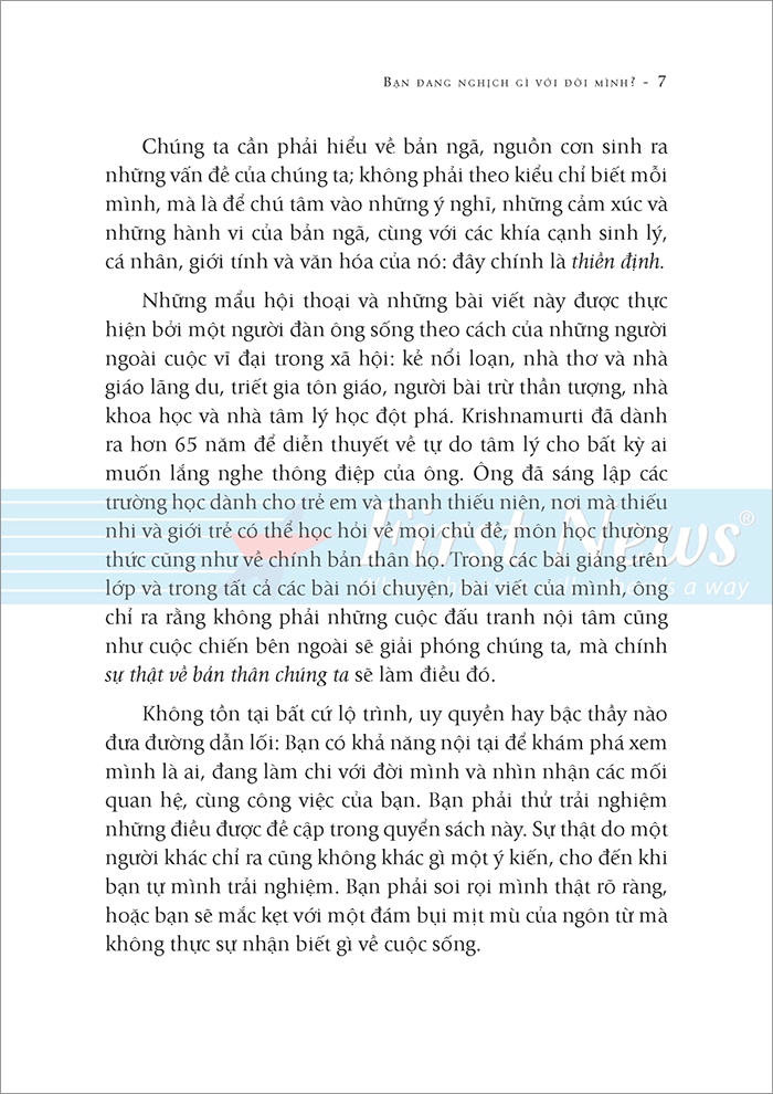 Cuốn sách Bạn đang nghịch gì với đời mình? của Jiddu Krishnamurti là một tác phẩm triết học nổi tiếng, được đánh giá là một trong những cuốn sách hay nhất về cuộc sống. Cuốn sách mang đến cho người đọc những suy nghĩ sâu sắc và thấu đáo về nhiều vấn đề trong cuộc sống của con người, từ bản ngã, hiểu biết bản thân, giáo dục, công việc, tiền bạc, cho đến những mối tương quan giữa con người với nhau.