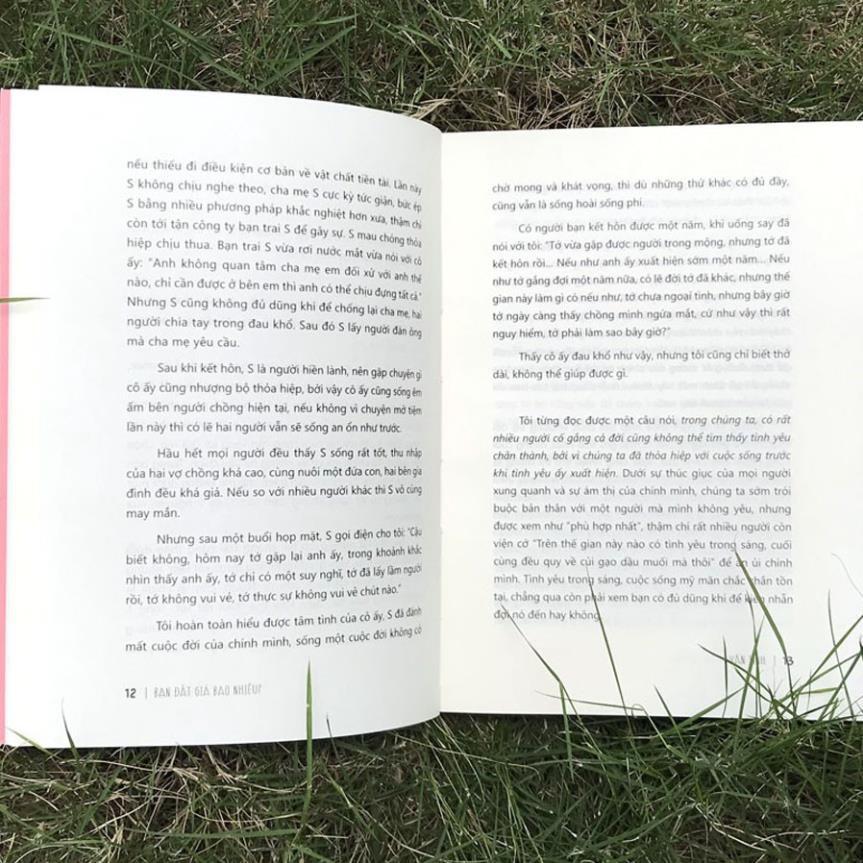 - Bạn Đắt Giá Bao Nhiêu? Câu trả lời này do chính bạn quyết định, chính bạn “định giá”. Đọc cuốn sách này, đôi khi bạn nên dừng lại và thành thực với bản thân, liệu bạn có đang là phiên-bản-mà-bạn-yêu-thích-nhất, phiên-bản-bạn-mong- muốn-trở-thành. Hãy thử trả lời các câu hỏi: Sự thỏa hiệp có làm bạn hạnh phúc hay không? Bạn có đang cố gắng lấy lòng tất cả mọi người? Bạn có dám thay đổi? Và quan trọng nhất: Bạn đắt giá bao nhiêu?