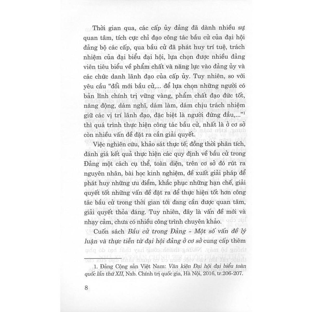 Cuốn sách khái quát một số vấn đề lý luận về bầu cử nói chung; khảo sát, phân tích, đánh giá những kết quả đạt được, những vấn đề còn tồn tại trong công tác bầu cử ở đại hội cơ sở của một số địa phương vùng đồng bằng sông Hồng; trên cơ sở những hướng dẫn, chỉ đạo của Trung ương Đảng, tác giả đề xuất một số giải pháp mà các cơ sở đảng cần thực hiện tốt để công tác bầu cử thực sự mang lại hiệu quả thiết thực nhất, góp phần vào thành công của đại hội đảng bộ các cấp, tiến tới Đại hội đại biểu toàn quốc lần thứ XIII của Đảng. Qua đó, cung cấp cho bạn đọc, nhất là đội ngũ cán bộ lãnh đạo ở cơ sở những luận cứ mang tính lý luận và thực tiễn về hoạt động bầu cử trong Đảng.