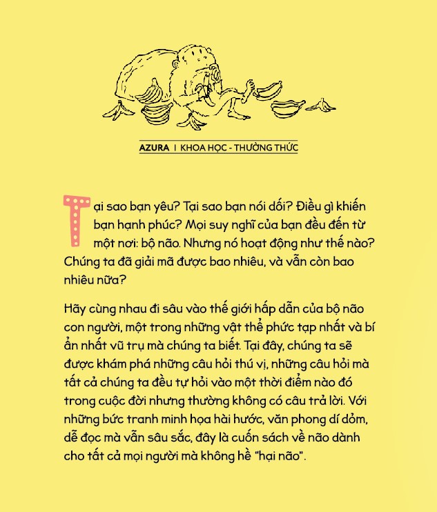 Hãy cùng nhau đi sâu vào thế giới hấp dẫn của bộ não con người, một trong những vật thể phức tạp nhất và bí ẩn nhất vũ trụ mà chúng ta biết. Tại đây, chúng ta sẽ được khám phá những câu hỏi thú vị, những câu hỏi mà tất cả chúng ta đều tự hỏi vào một thời điểm nào đó trong cuộc đời nhưng thường không có câu trả lời. Với những bức tranh minh họa hài hước, văn phong dí dỏm, dễ đọc mà vẫn sâu sắc, đây là cuốn sách về não dành cho tất cả mọi người mà không hề "hại não".