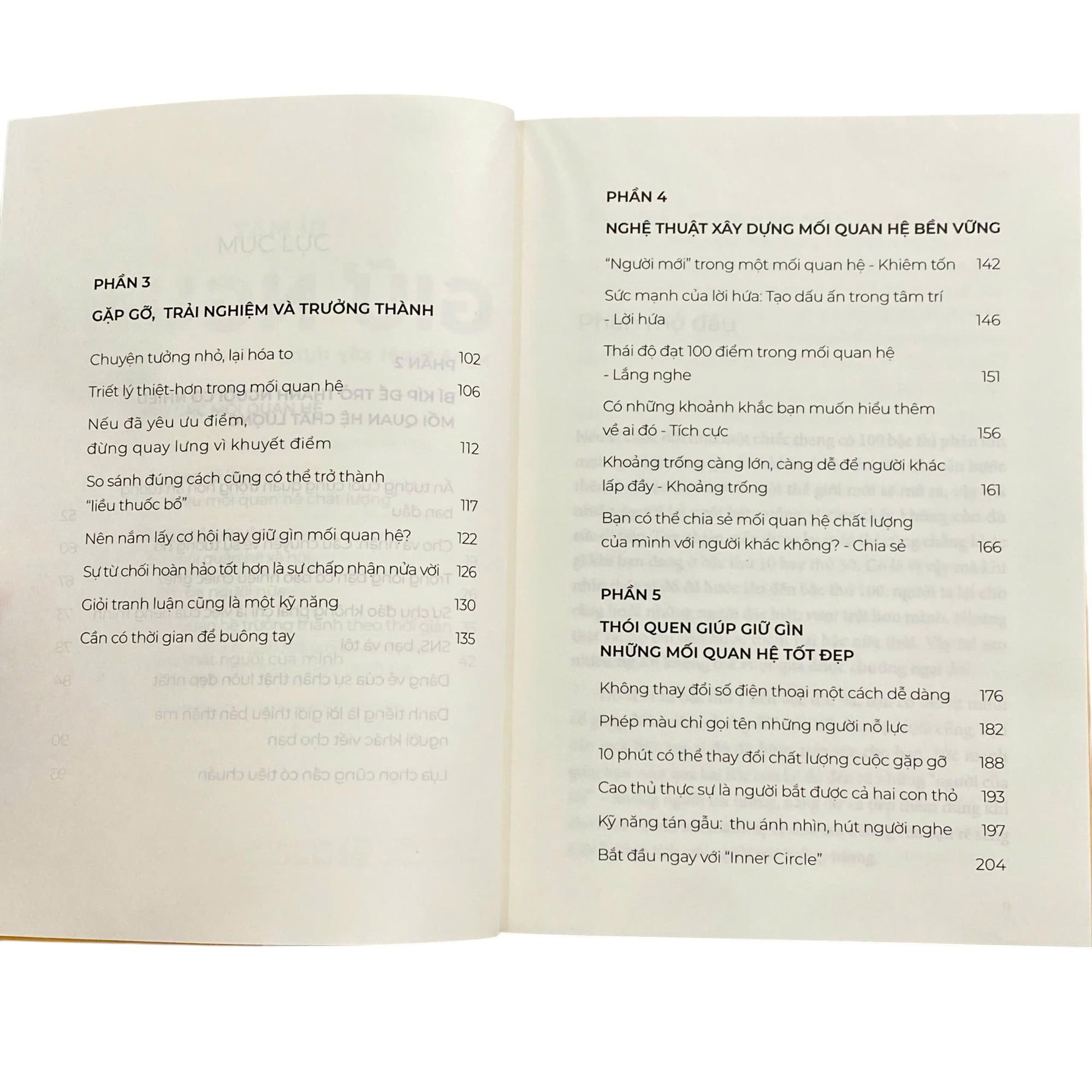 những lời khuyên thực tế nhưng tinh tế: cách gây ấn tượng đúng lúc, cách giữ liên lạc một cách tự nhiên, cách từ chối nhưng không tổn thương, hay cách xây dựng “vòng tròn quan hệ” đa dạng, cân bằng và bền vững.