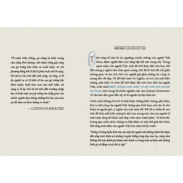 Thờ cúng tổ tiên là tín ngưỡng truyền thống của người Việt Nam, được người dân mọi tầng lớp hết sức trọng thị. Trong quan niệm của người Việt, mỗi đồ thờ được đặt trên ban thờ đều mang ý nghĩa tâm linh quan trọng, bởi đó là thứ kết nối giữa dương gian và âm thế, thứ con người gửi gắm những kỳ vọng và mong ước tốt đẹp. Và để hiểu hơn về ý nghĩa, vai trò của mỗi biểu tượng, phù hiệu và món đồ thờ được đặt trên ban thờ của người Việt, cuốn sách BIỂU TƯỢNG, PHÙ HIỆU VÀ ĐỒ THỜ CỦA NGƯỜI AN NAM, một trong số nhiều nghiên cứu của Gustave Dumoutier về văn hóa dân gian Bắc kỳ, sẽ là nguồn tư liệu hữu ích.