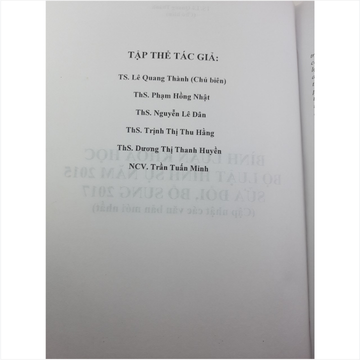 Sách Bình Luận Khoa Học Bộ Luật Hình Sự Năm 2015 Sửa Đổi, Bổ Sung Năm 2017 do TS:LÊ QUANG THÀNH làm chủ biên cùng tập thể tác giả biên soạn. Sách xuất bản vào tháng 6/2020, đây
