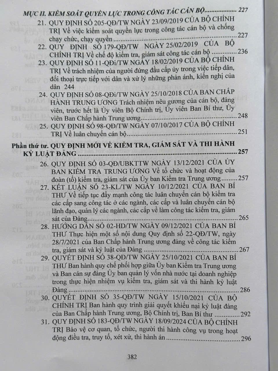 – Quyết định số 165-QĐ/TW ngày 06/06/2024 Ban hành quy trình xem xét, thi hành kỷ luật đối với tổ chức đảng, đảng viên thuộc thẩm quyền Ban Chấp hành Trung ương Đảng, Bộ Chính trị, Ban Bí thư;