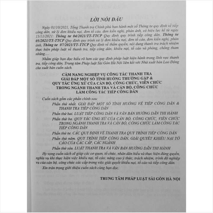 Nhằm phổ biến đến Quý Cơ quan, Đơn vị và Quý khách hàng thân thiết nắm bắt kịp thời những quy định mới nêu trên. Nhà sách Nam Việt xin trân trọng giới thiệu cuốn sách: Cẩm Nang Nghiệp Vụ Công Tác Thanh Tra - Giải Đáp Một Số Tình Huống Thường Gặp - Quy Tắc Ứng Xử của Cán Bộ, Công Chức, Viên Chức Trong Ngành Thanh Tra và Cán Bộ, Công Chức Làm Công Tác Tiếp Công Dân