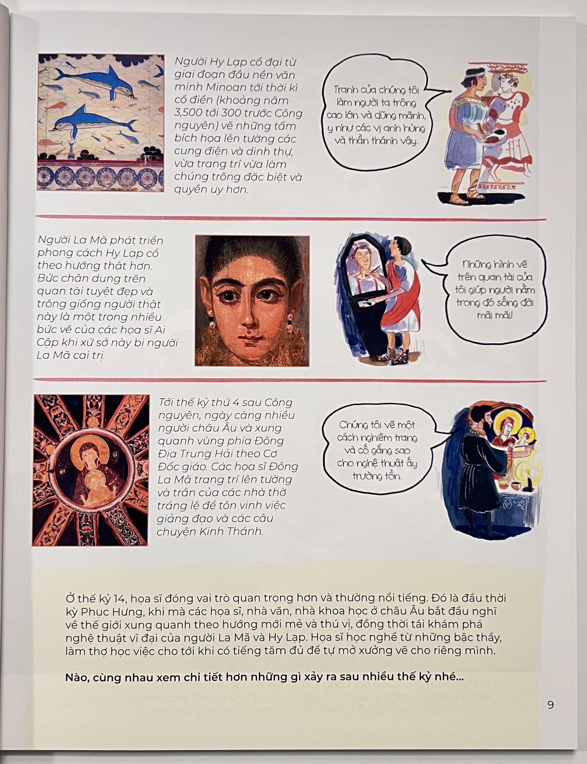 "Câu chuyện hội họa: Lịch sử hội họa dành cho thiếu nhi" đưa độc giả nhỏ tuổi vào cuộc hành trình nghệ thuật từ nghệ thuật hang động thời tiền sử đến tranh vẽ graffiti đương đại. Cuốn sách minh họa phong phú này bao gồm 39 tác phẩm nghệ thuật quan trọng, từ các bức vẽ hang động cổ xưa cho tới các tác phẩm mang tính biểu tượng của Botticelli, Velázquez, Dalí, Picasso, Kahlo và Basquiat. Được thiết kế để thu hút trẻ em, cuốn sách cho thấy tác phẩm của họa sĩ, kèm theo hình hoạt hình và lời nhắc tương tác để kích thích trí tò mò và khả năng quan sát.