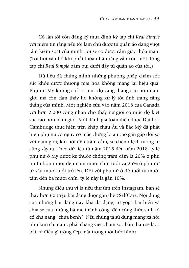 Nếu bạn từng cảm thấy mệt mỏi với những lời khuyên sáo rỗng về chăm sóc bản thân, nếu bạn muốn tìm một cách tiếp cận thật sự hiệu quả từ một chuyên gia nhiều kinh nghiệm, “Chăm sóc bản thân thật sự” là quyển sách dành cho bạn. Đọc quyển sách này, bạn sẽ học được cách yêu thương bản thân thay vì lúc nào cũng chạy theo những tiêu chuẩn do xã hội áp đặt.