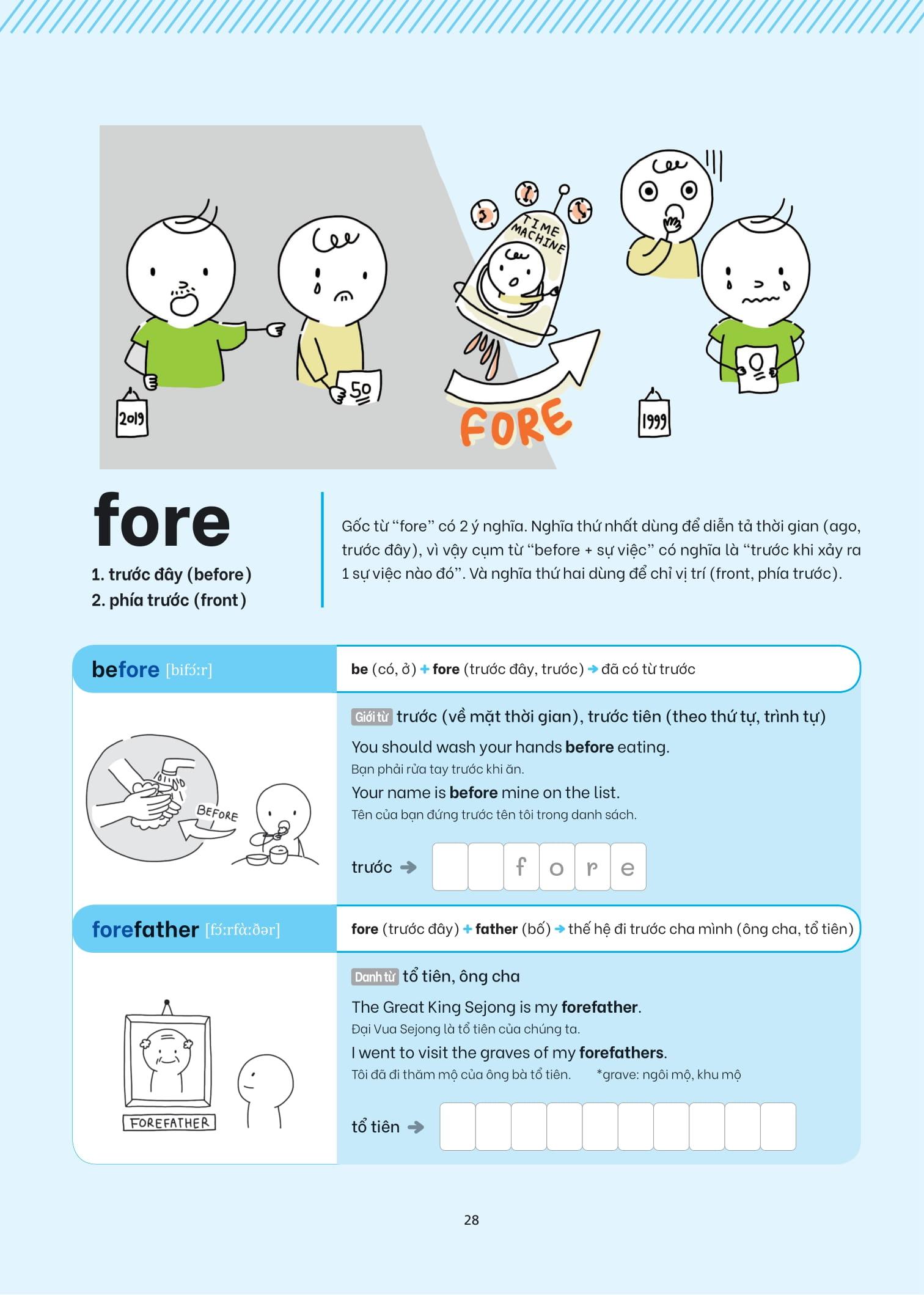 - Minh họa bằng hình ảnh sinh động, trực quan: Các gốc từ được diễn họa bằng tranh minh họa thú vị, giúp kích hoạt trí tưởng tượng, phù hợp với người học thích phương pháp học qua thị giác.