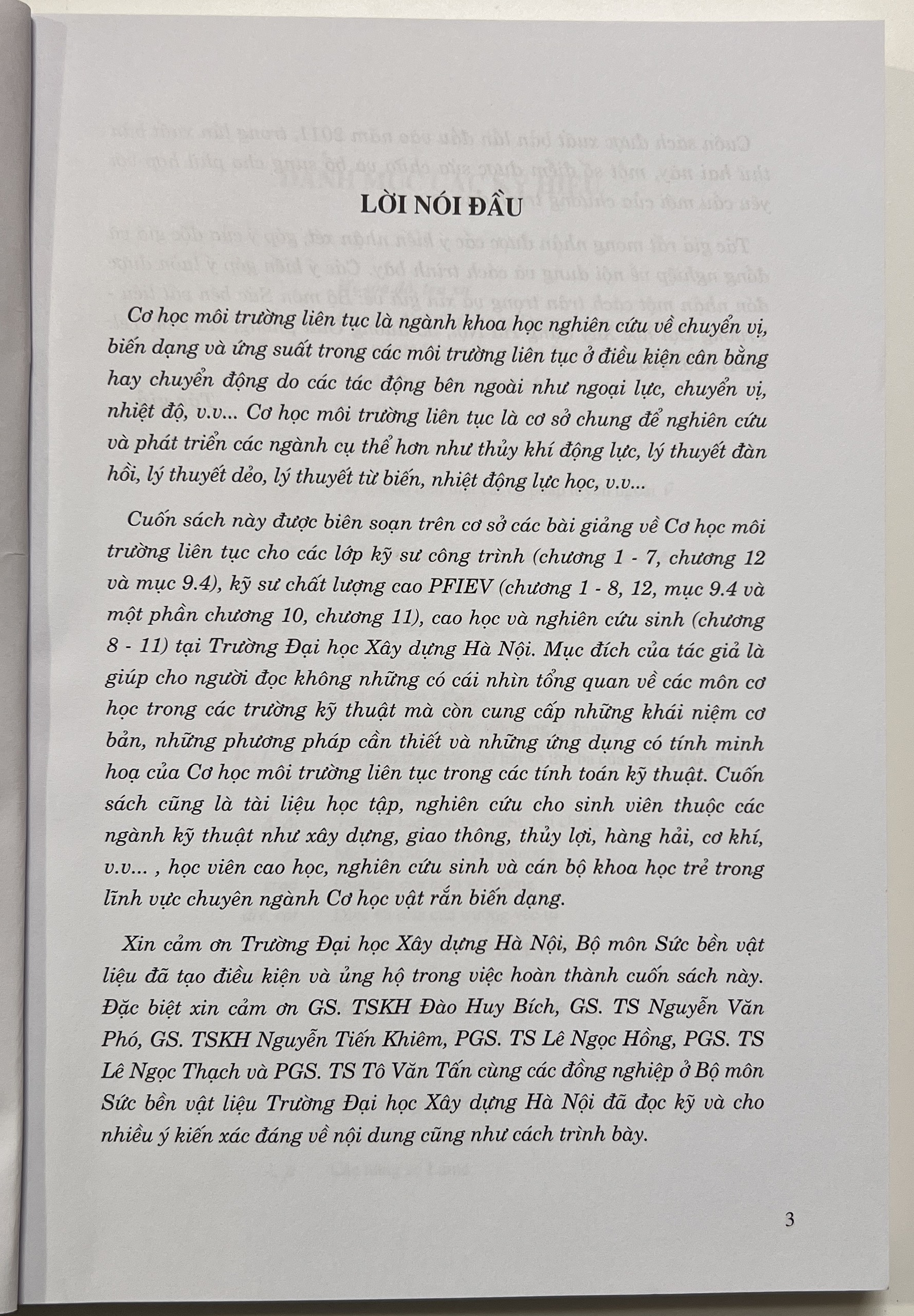 Cuốn sách này được biên soạn trên cơ sở các bài giảng về Cơ học môi trường liên tục cho các lớp kỹ sư công trình (chương 1 - 7, chương 12 và mục 9.4), kỹ sư chất lượng cao PFIEV (chương 1 - 8, 12, mục 9.4 và một phần chương 10, chương 11), cao học và nghiên cứu sinh (chương 8 - 11) tại Trường Đại học Xây dựng Hà Nội. Mục đích của tác giả là giúp cho người đọc không những có cái nhìn tổng quan về các môn cơ học trong các trường kỹ thuật mà còn cung cấp những khái niệm cơ bản, những phương pháp cần thiết và những ứng dụng có tính minh hoạ của Cơ học môi trường liên tục trong các tính toán kỹ thuật. Cuốn sách cũng là tài liệu học tập, nghiên cứu cho sinh viên thuộc các ngành kỹ thuật như xây dựng, giao thông, thủy lợi, hàng hải, cơ khí, v.v... , học viên cao học, nghiên cứu sinh và cán bộ khoa học trẻ trong lĩnh vực chuyên ngành Cơ học vật rắn biến dạng.