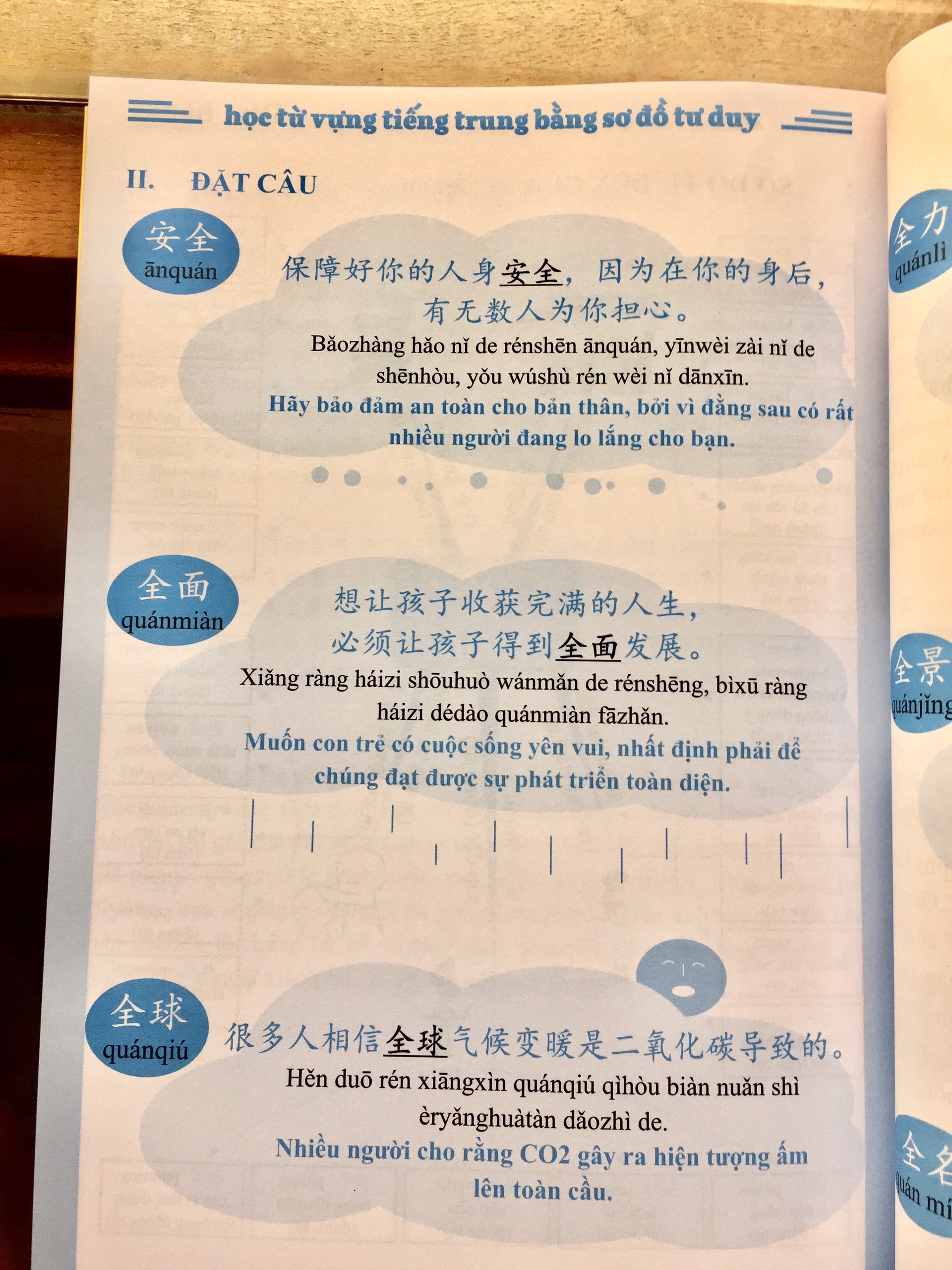Cẩm Nang Nâng Cấp Từ Vựng Tiếng Trung Theo Chủ Đề - Tập 2 Hành trình chinh phục Hán ngữ sẽ đạt hiệu quả tối ưu khi người học xây dựng được một vốn từ vựng phong phú và hệ thống. Việc mở rộng vốn từ không chỉ củng cố nền tảng ngôn ngữ vững chắc mà còn đóng vai trò then chốt trong việc phát triển đồng đều cả bốn kỹ năng ngôn ngữ: nghe, nói, đọc và viết. Nhằm đáp ứng nhu cầu học tập thiết thực, bộ sách “Cẩm nang nâng cấp từ vựng tiếng Trung theo chủ đề” (gồm 2 tập) được biên soạn với mục tiêu giúp người học ghi nhớ từ vựng một cách hệ thống, tạo liên kết chặt chẽ giữa các từ đã học và khắc phục tình trạng học rời rạc, mau quên. Phương pháp học theo chủ đề cho phép người học nhóm các từ vựng liên quan lại với nhau, từ đó dễ dàng mở rộng, liên tưởng và ghi nhớ sâu hơn khi bắt gặp từ mới. Bộ sách tập trung vào những chủ đề thông dụng, sát thực với đời sống hiện đại: - Tập 2: Thiên nhiên, cơ thể người, cảm xúc, tính cách.
