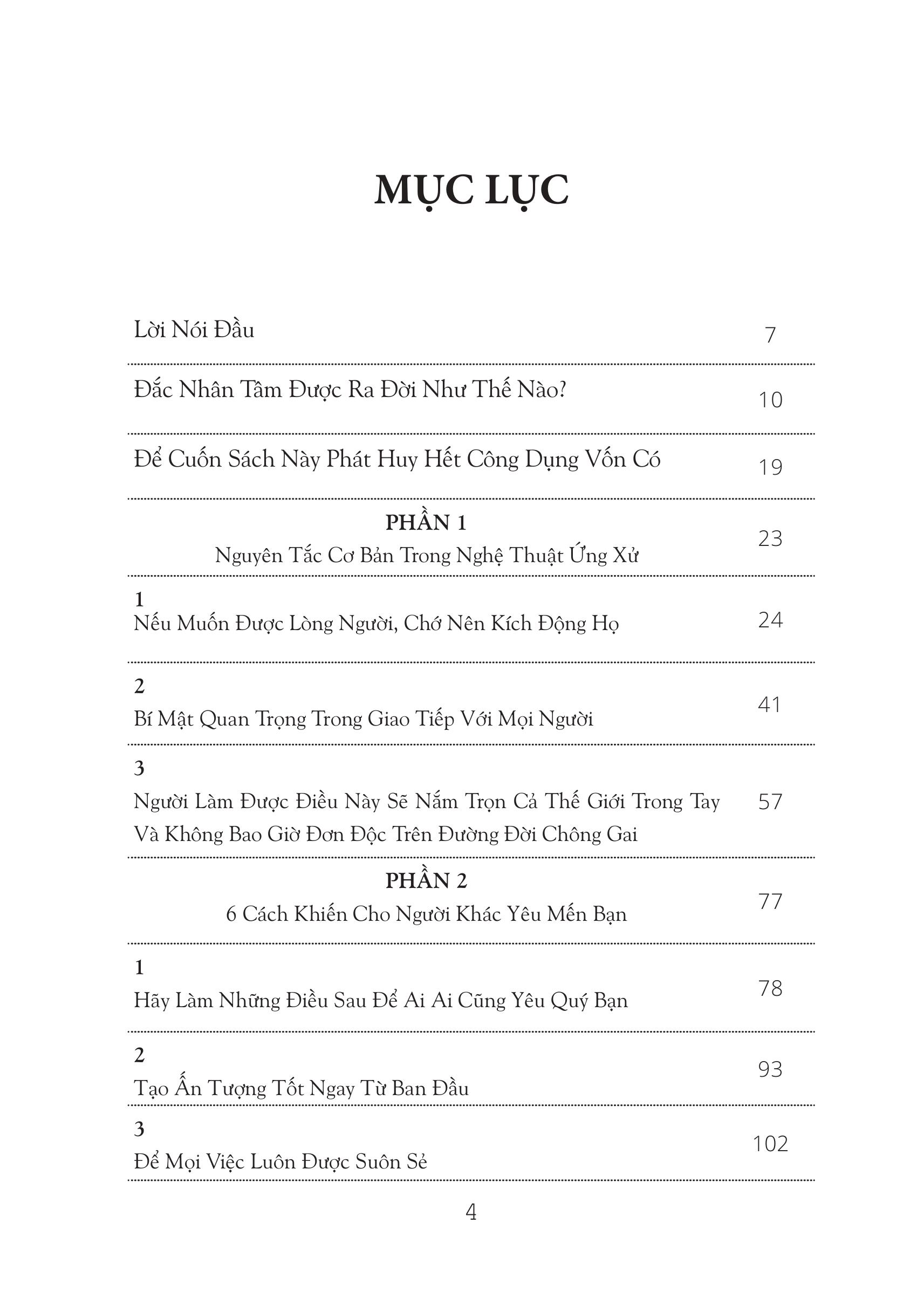 - Năm xuất bản: 2024 GIỚI THIỆU SẢN PHẨM Nếu bạn còn lúng túng mỗi khi trò chuyện thì cuốn sách Đắc Nhân Tâm của tác giả Dale Carnegie chính là những gì bạn cần. Mỗi trang sách đúc kết kinh nghiệm từ bậc thầy giao tiếp sẽ mở ra những góc nhìn thú vị về tâm lý - hành vi của con người dưới tác động của ngôn từ. Các nguyên tắc trong đây sẽ là chìa khoá giúp cho cuộc sống của bạn trở nên hạnh phúc, thành công hơn. Đây là quyển sách duy nhất về thể loại self-help liên tục đứng đầu danh mục sách bán chạy nhất (best-selling Books) do báo The New York Times bình chọn suốt 10 năm liền và đã được dịch ra hơn 50 ngôn ngữ khác nhau Riêng bản tiếng Anh của sách đã bán được hơn 15 triệu bản trên thế giới. Tác phẩm có sức lan toả vô cùng rộng lớn - dù bạn đi đến bất cứ đâu, bất kỳ quốc gia nào cũng đều có thể nhìn thấy. Tác phẩm được đánh giá là quyển sách đầu tiên và hay nhất, có ảnh hưởng làm thay đổi cuộc đời của hàng triệu người trên thế giới. Đắc nhân tâm và cái Tài trong mỗi người chúng ta. Đắc Nhân Tâm trong ý nghĩa đó cần được thụ đắc bằng sự hiểu rõ bản thân, thành thật với chính mình, hiểu biết và quan tâm đến những người xung quanh để nhìn ra và khơi gợi những tiềm năng ẩn khuất nơi họ, giúp họ phát triển lên một tầm cao mới. Đây chính là nghệ thuật cao nhất về con người và chính là ý nghĩa sâu sắc nhất đúc kết từ những nguyên tắc vàng của Dale Carnegie. SƠ LƯỢC VỀ NỘI DUNG Cuốn sách bao gồm 4 phần giúp cho mỗi cá nhân sẽ có thể hiểu được nguyên tắc cơ bản về nghệ thuật ứng xử, giúp người khác yêu mến, ủng hộ quan điểm cũng như giúp bạn trở thành một nhà lãnh đạo tài ba. Phần 1: Nguyên tắc cơ bản trong nghệ thuật ứng xử Phần 2: 6 các khiến cho người khác yêu mến bạn Phần 3: Làm sao để người khác ủng hộ quan điểm của bạn Phần 4: Trở thành nhà lãnh đạo: thay đổi quan điểm của người khác mà không vấp phải sự phản bác MỘT SỐ HÌNH ẢNH NỘI DUNG THAM KHẢO CAM KẾT