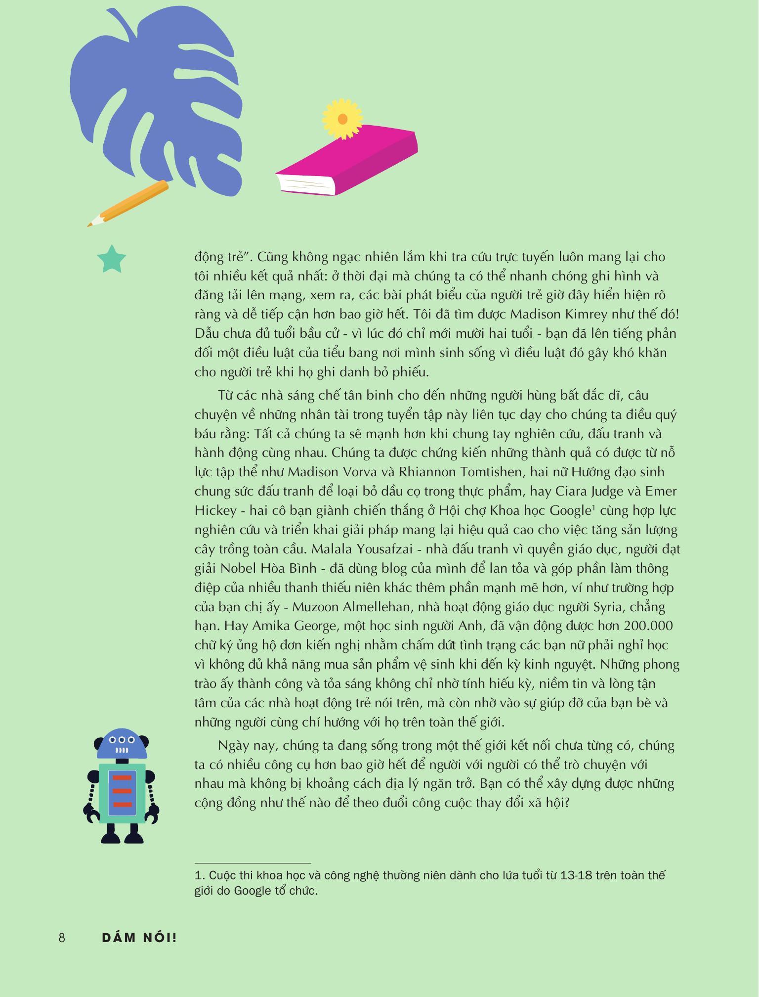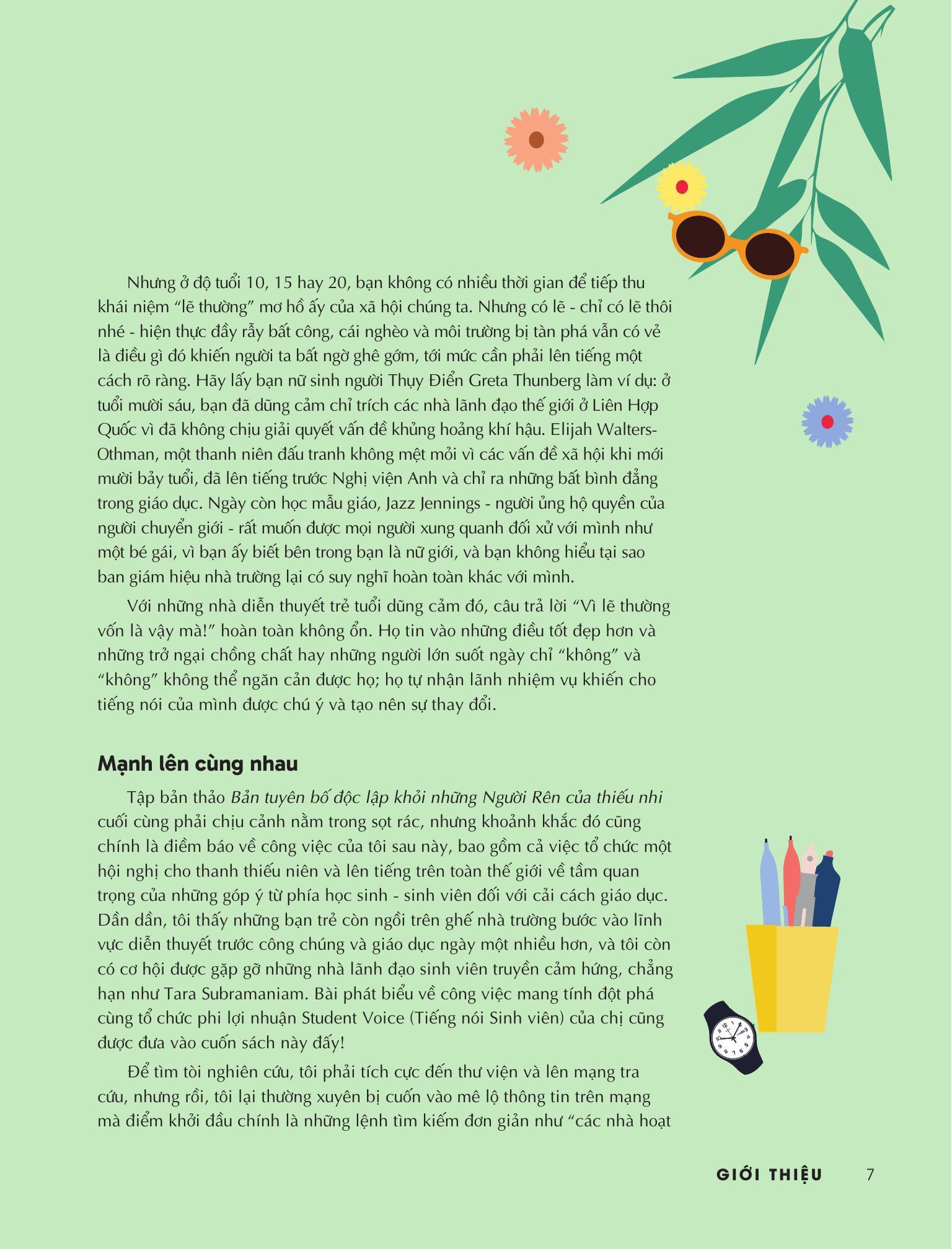 Cuốn sách mang đến thông điệp ý nghĩa, là lời nhắc nhở rằng, trong suốt lịch sử phát triển của nhân loại, luôn có những người trẻ dám đứng lên để bảo vệ lý tưởng. Không phân biệt giới tính, quốc gia hay ngành nghề, họ đều có chung một đặc điểm: dám nói lên quan điểm và hành động vì cộng đồng.