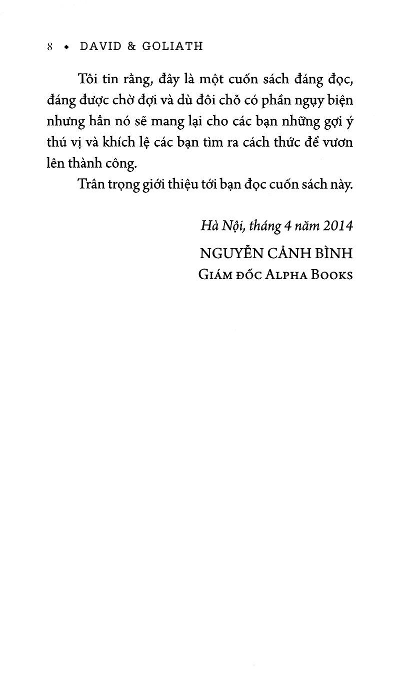 Độc giả Việt Nam chắc hẳn đã quen thuộc và yêu thích các cuốn sách của Michael Gladwell trước đây: Điểm bùng phát (2000) viết về những thời khắc quan trọng và bùng nổ của một ý tưởng hoặc một sản phẩm; Trong chớp mắt (2005) với những khoảnh khắc xuất thần và trực giác của con người; Những kẻ xuất chúng nói về thành công và khả năng thiên tài của con người thông qua rèn luyện; Chú chó nhìn thấy gì tập hợp các bài viết dưới góc nhìn khác lạ, dí dỏm, độc đáo của ông và tác phẩm mới nhất của ông, David chống lại Goliath, mà các bạn đang cầm trên tay tái hiện lại cuộc chiến đấu chống lại các gã khổng lồ của những con người nhỏ bé trong thực tế cuộc sống, trên thương trường và cả lĩnh vực chính trị xã hội, v.v…
