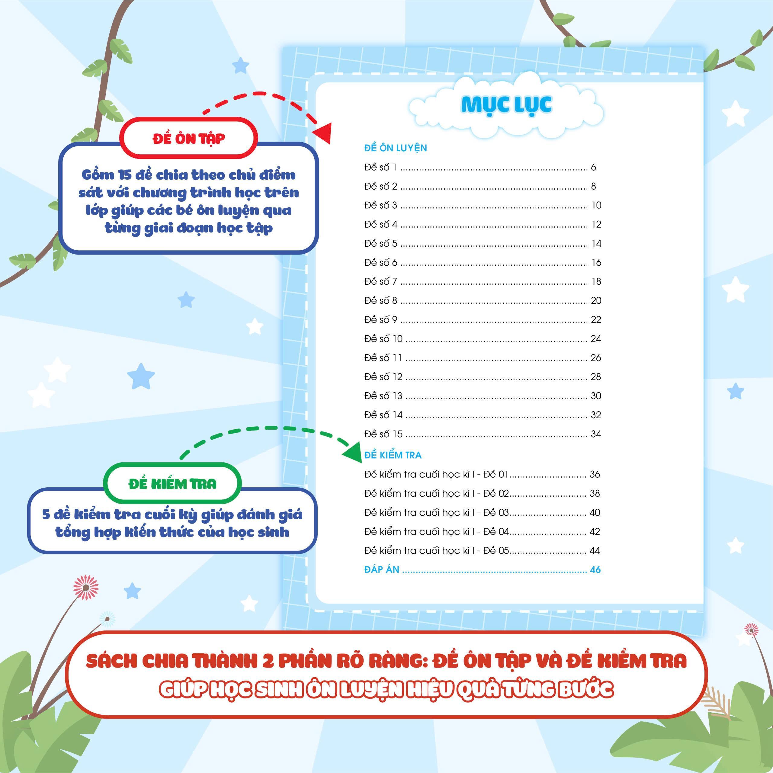 Phần đề ôn tập: gồm 15 đề được chia theo các chủ điểm, ôn tập theo sát chương trình học trên lớp theo giai đoạn.