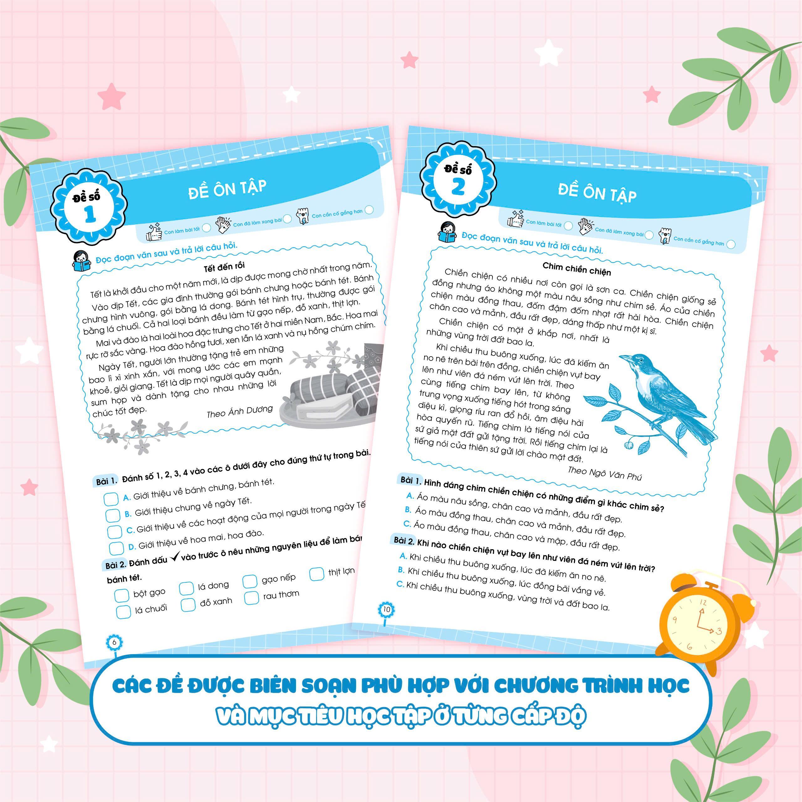 - Sách được chia thành 2 phần rất dễ hiểu cho các bé: Phần đề ôn tập và Phần đề kiểm tra. Phần đề ôn tập: Gồm 15 đề được chia theo các chủ điểm, hoặc chia thành các đề ôn tập theo sát chương trình học trên lớp theo giai đoạn. Phần đề kiểm tra: Gồm 5 đề kiểm tra cuối học kỳ để kiểm tra, đánh giá kiến thức tổng hợp của học sinh.