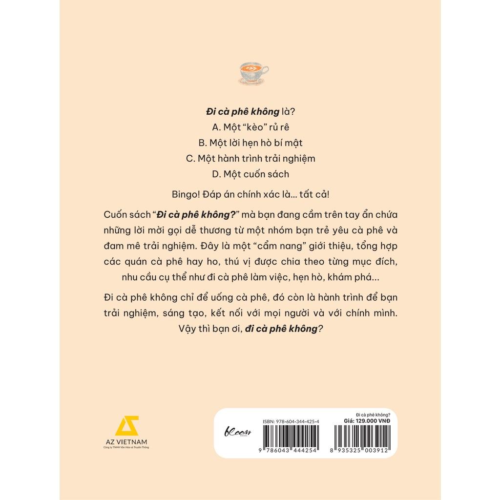 Cuốn sách “Đi cà phê không?” mà bạn đang cầm trên tay ẩn chứa những lời mời gọi dễ thương từ một nhóm bạn trẻ yêu cà phê và đam mê trải nghiệm. Đây là một “cẩm nang” giới thiệu, tổng hợp các quán cà phê hay ho, thú vị được chia theo từng mục đích, nhu cầu cụ thể như đi cà phê làm việc, hẹn hò, khám phá