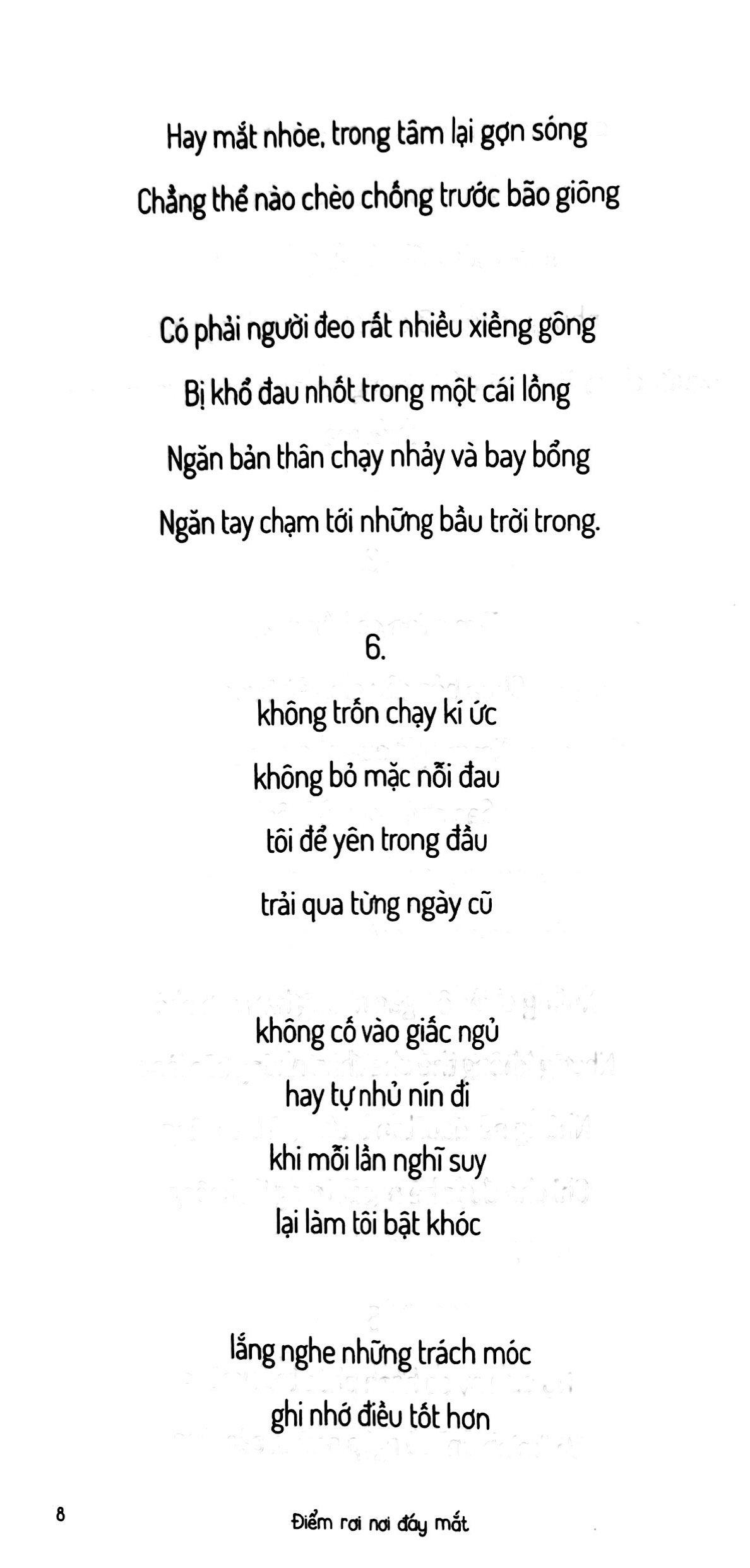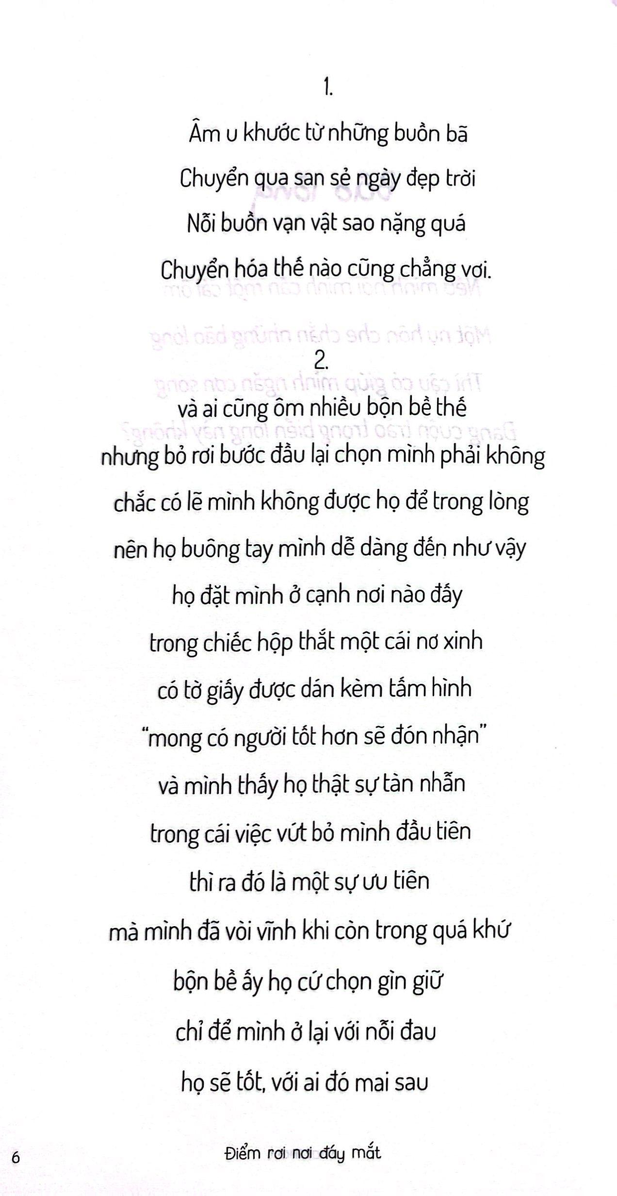 Điểm Rơi Nơi Đáy Mắt “Điểm rơi nơi đáy mắt” chứa đựng những lời thơ và câu văn đầy bất lực day dứt về một tuổi trẻ bị phủ bởi những vết xước mà cuộc sống này đem lại. Cuốn sách tựa sợi dây níu kéo bạn lại với thế giới này, tựa chiếc ôm ấm áp, đầy dịu dàng và thấu hiểu ôm lấy bạn nếu bạn đang: có những ngày mọi thứ làm bạn phát điên lên dù chỉ là một việc nhỏ; có những ngày bạn muốn chết quách đi cho rồi; có những ngày bạn sống mà ngỡ như đã chết; có những ngày bạn bị vùi lấp trong những cơn đau,... Dù có những lúc bạn không thấy ánh sáng cuối con đường, nhưng hy vọng vẫn luôn tồn tại. Đó là lý do vì sao bạn vẫn đang ở đây, vẫn tiếp tục tiến lên. Mọi thứ có thể thay đổi, có thể tốt đẹp hơn. Điều quan trọng là bạn không từ bỏ. Bạn xứng đáng có một tương lai tươi sáng hơn. Hãy nhớ rằng, bạn không cô đơn trong cuộc chiến này. Bạn là một phần quan trọng của thế giới, và thế giới cần bạn. Dù con đường có gập ghềnh, nhưng phía trước luôn có hy vọng, và bạn xứng đáng có được một cuộc sống trọn vẹn và hạnh phúc. “mong nhiều đêm cậu sẽ thôi thức trắng có một giấc ngủ ngon và yên lành mong mọi ngày bầu trời đều trong xanh để gió mang dịu dàng hôn mái tóc có những ngày chỉ mong cậu bật khóc cho gò má ướt đẫm mắt đỏ hoe để tầm nhìn đôi mắt nhỏ bị nhòe không thấy những đớn đau của thế giới cậu hãy mang nỗi buồn đi kí gửi vào làn gió hay làn nước dịu êm vào góc khuất cây lá phía ngoài thềm hay nén vào thốt ra bằng lời nói…”