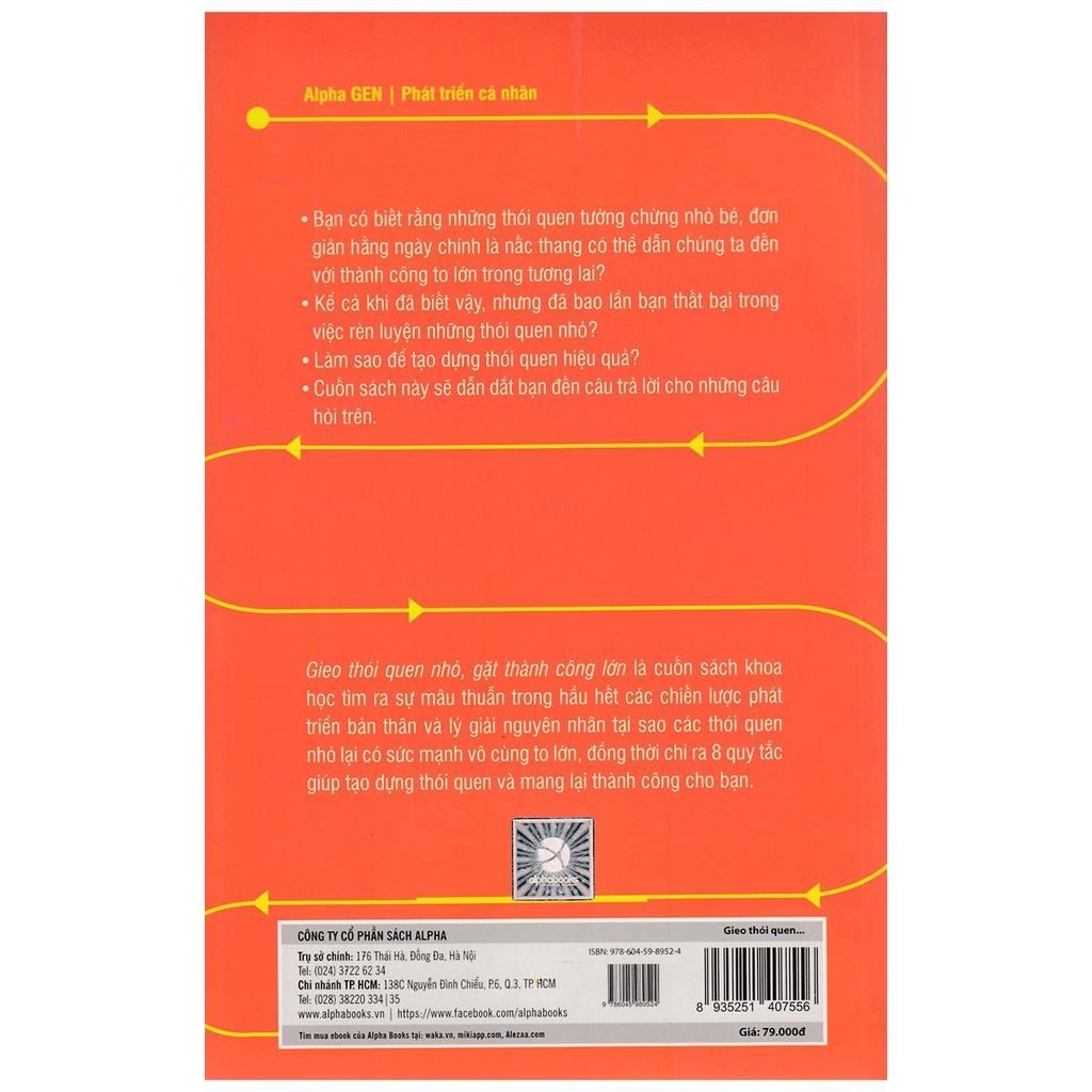 Gieo thói quen nhỏ, gặt thành công lớn là cuốn sách khoa học tìm ra sự mâu thuẫn trong hầu hết các chiến lược phát triển bản thân và lý giải nguyên nhân tại sao các thói quen nhỏ lại tạo nên sự thống nhất rõ rệt. Một thói quen nhỏ là hành vi tích cực rất nhỏ mà bạn bắt bản thân phải làm mỗi ngày. Nó “quá nhỏ để thất bại” nhưng lại mạnh mẽ không thể lường trước và là một chiến lược góp phần hình thành nên thói quen ưu việt.