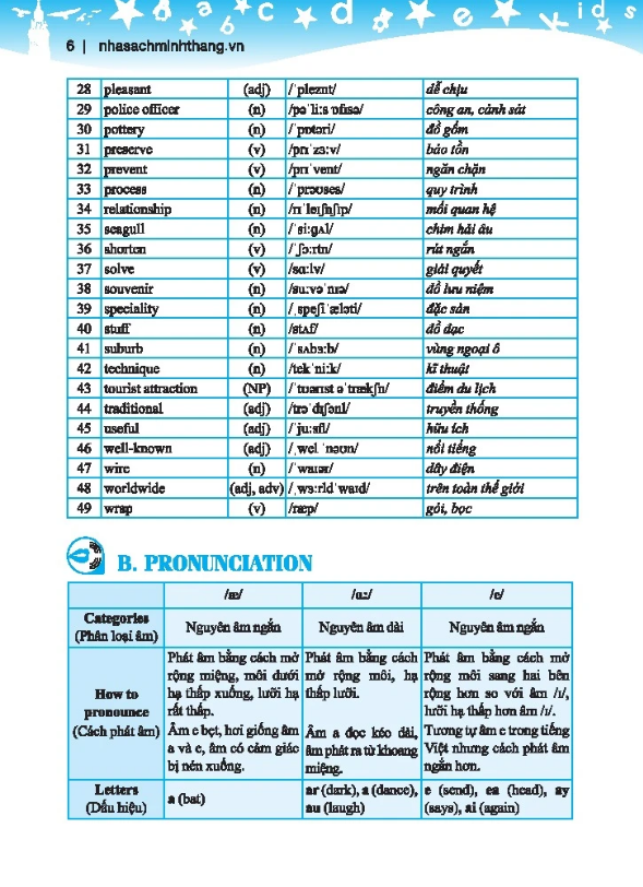 - Mỗi đơn vị bài học gồm 4 phần: +PART A: VOCABULARY (Từ vựng theo từng đơn vị bài học) +PART B: PRONUNCIATION (Lý thuyết phát âm) +PART C: GRAMMAR (Lý thuyết ngữ pháp trọng tâm) +PART D: PRACTICE (Cùng có PHÁT ÂM, TỪ VỰNG, NGỮ PHÁP, KỸ NĂNG ĐỌC và KỸ NĂNG VIẾT) Bên cạnh đó, hệ thống bài kiểm tra (TEST) đa dạng hình thức trắc nghiệm và tự luận, bám sát các nội dung, dạng bài trong đề thi thật giúp các em ôn tập và rèn luyện thước các kỳ thi 15 phút, 45 phút, cuối kỳ.