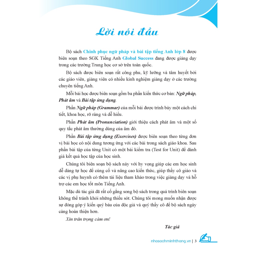 GLOBAL SUCCESS - Chinh Phục Ngữ Pháp Và Bài Tập Tiếng Anh lớp 8 tập 1 Bộ sách “Chinh phục ngữ pháp và bài tập tiếng Anh” từ lớp 6 đến lớp 12 được biên soạn theo khung chương trình tiếng Anh đang được giảng dạy trong các trường trung học cơ sở và trung học phổ thông trên toàn quốc. Bộ sách được biên soạn rất công phu, kỹ lưỡng và tâm huyết bởi các giáo viên, giảng viên có nhiều kinh nghiệm giảng dạy ở các trường chuyên Anh. Với mỗi bài học, chúng tôi đều biên soạn theo ba phần kiến thức cơ bản:Phát âm, ngữ pháp bài tập ứng dụng.- Phần Phát âm giới thiệu cách phát âm và một số quy tắc phát âm thường dùng.- Phần Ngữ pháp của mỗi bài được trình bày một cách chi tiết, khoa học rõ ràng, dễ hiểu.- Phần Bài tập: Các bài tập được biên soạn theo từng Unit có nội dung tương ứng với từng đơn vị bài học trong sách giáo khoa. Sau phần bài tập của từng Unit có một bài kiểm tra (Test for unit) để đánh giá kết quả học tập của học sinh. Chúng tôi biên soạn bộ sách này với hy vọng giúp các em học sinh tự học một cách dễ dàng, củng cố và nâng cao kiến thức, đồng thời giúp cho thầy cô giáo và các phụ huynh có thêm tài liệu tham khảo trong việc giảng dạy và kèm cặp các em học tốt môn Tiếng Anh.