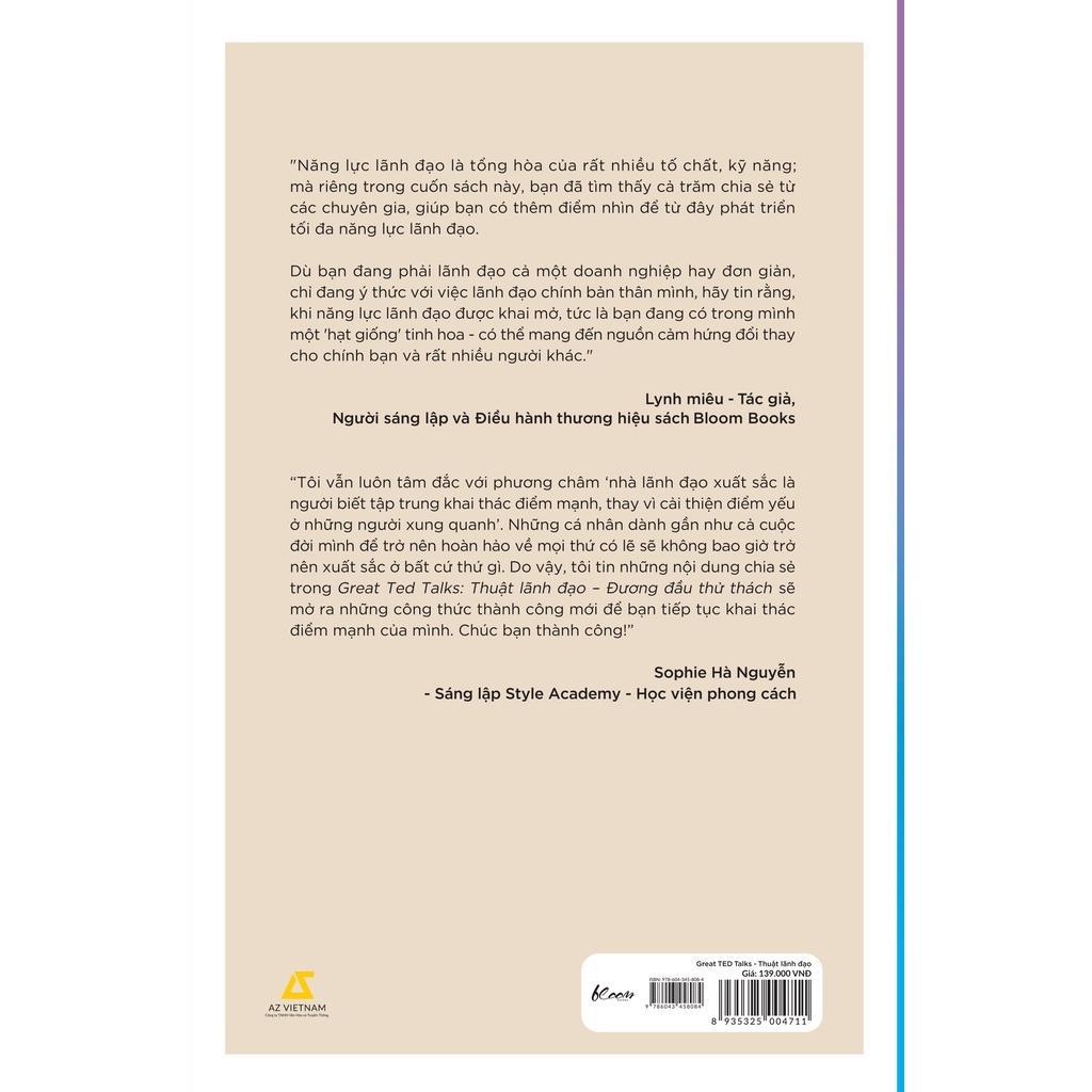 Great TED Talks: Thuật lãnh đạo – Đương đầu thử thách là một cuốn sách đặc biệt về đề tài LÃNH ĐẠO. Thông qua 100 bài chia sẻ trên sân khấu TED về chủ đề này, độc giả sẽ có cái nhìn đa chiều và toàn diện hơn về lãnh đạo. Lãnh đạo không chỉ xuất hiện ở nơi làm việc hay ám chỉ năng lực tạo ảnh hưởng lên người khác mà còn được bộc lộ ở mọi mặt trong đời sống. Những câu chuyện trong sách giúp người đọc nhìn nhận những khía cạnh và tố chất khác nhau của một nhà lãnh đạo. Và mặc dù không phải người làm lãnh đạo nào cũng hội tụ đầy đủ những phẩm chất này, cuốn sách vẫn cho chúng ta hy vọng vào một thế hệ lãnh đạo mới trong tương lai. Qua đây, tác giả Harriet Minter cũng mong muốn bạn đọc sẽ có thêm cảm hứng, linh hoạt trong cách nhìn nhận và điều chỉnh phong cách lãnh đạo của bản thân.