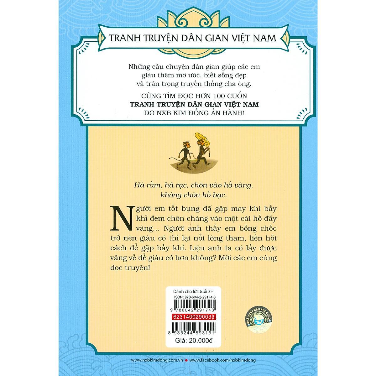 Giới thiệu sách Những câu chuyện dân gian giúp các em giàu thêm mơ ước, biết sống đẹp và trân trọng truyền thống cha ông. Cùng tìm đọc hơn 100 cuốn Tranh truyện dân gian Việt Nam do NXB Kim Đồng ấn hành! Tóm tắt nội dung "Hà rầm, hà rạc, chôn vào hố vàng, không chôn hố bạc.” Người em tốt bụng, cần cù đã gặp may khi bầy khỉ đem chôn chàng vào một cái hố đầy vàng… Người anh thấy em bỗng chốc trở nên giàu có thì lại nổi lòng tham, liền hỏi cách để gặp bầy khỉ. Liệu anh ta có lấy được vàng về để giàu có hơn không? Mời các em cùng đọc truyện!