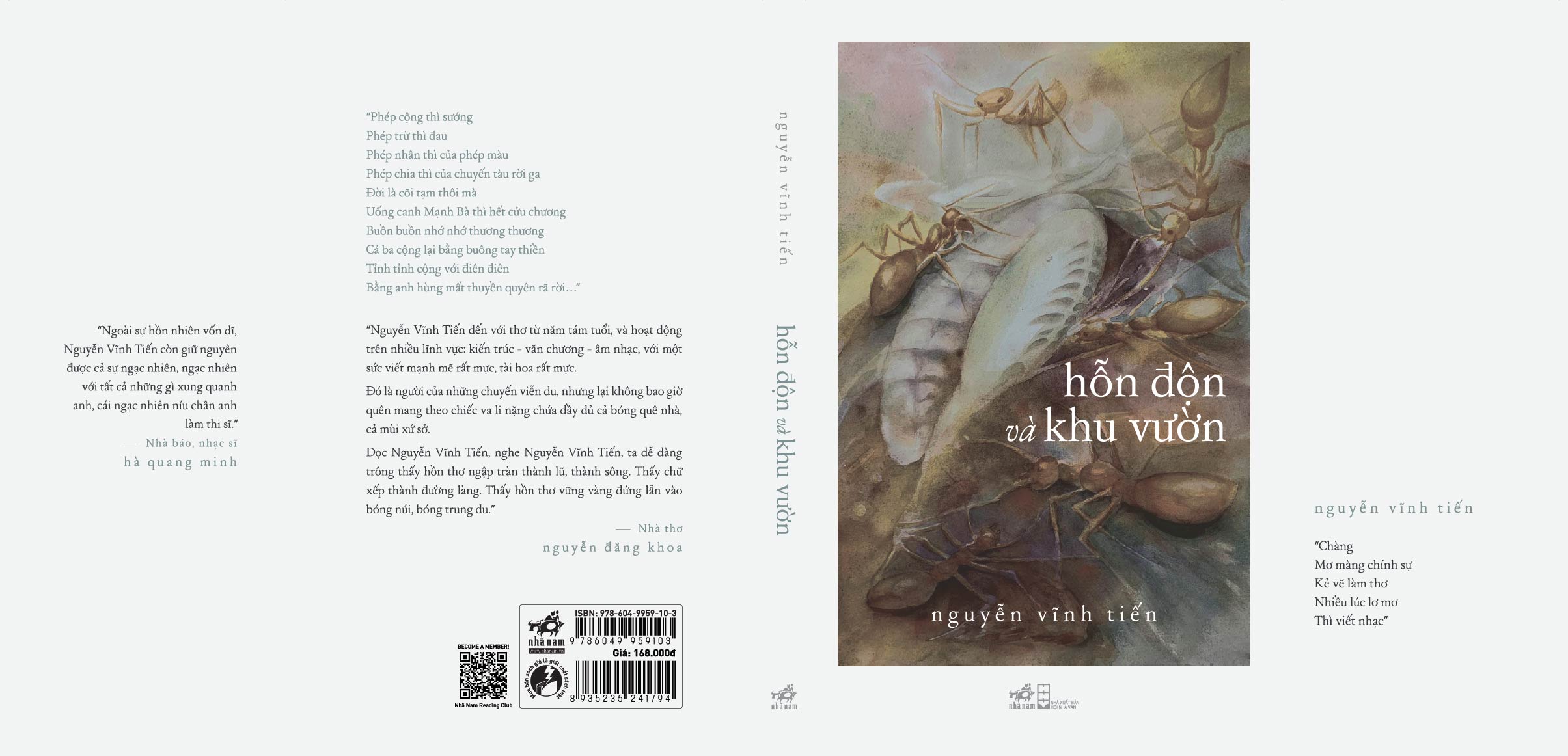 Tác giả: Nguyễn Vĩnh Tiến Nhà xuất bản: Hội nhà văn Kích thước: 15.5x24cm Số trang: 268 Ngày phát hành: 2024   "Phép cộng thì sướng Phép trừ thì đau Phép nhân thì của phép màu Phép chia thì của chuyến tàu rời ga Đời là cõi tạm thôi mà Uống canh Mạnh Bà thì hết cửu chương Buồn buồn nhớ nhớ thương thương Cả ba cộng lại bằng buông tay thiền Tỉnh tỉnh cộng với điên điên Bằng anh hùng mất thuyền quyên rã rờ" "Nguyễn Vĩnh Tiến đến với thơ từ năm tám tuổi, và hoạt động trên nhiều lĩnh vực: kiến trúc - văn chương - âm nhạc, với một sức viết mạnh mẽ rất mức, tài hoa rất mực. Đó là người của những chuyến viễn du, nhưng lại không bao giờ quên mang theo chiếc va li nặng chứa đầy đủ cả bóng quê nhà, cả mùi xứ sở. Đọc Nguyễn Vĩnh Tiến, nghe Nguyễn Vĩnh Tiến, ta dễ dàng trông thấy hồn thơ ngập tràn thành lũ, thành sông. Thấy chữ xếp thành đường làng. Thấy hồn thơ vững vàng đứng lẫn vào bóng núi, bóng trung du."