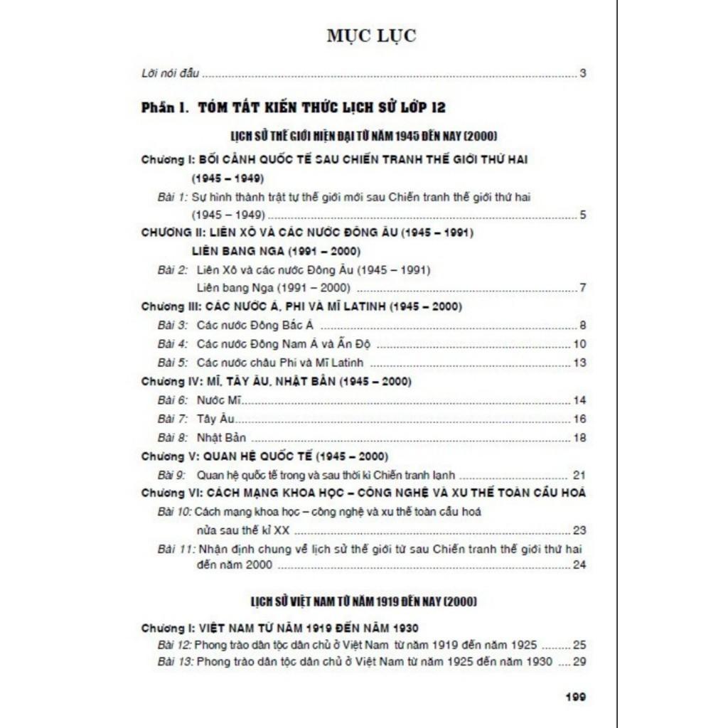 - Phần 1: Tóm tắt kiến thức Lịch sử lớp 12 Phần này gồm kiến thức lịch sử thế giới và lịch sử Việt Nam.